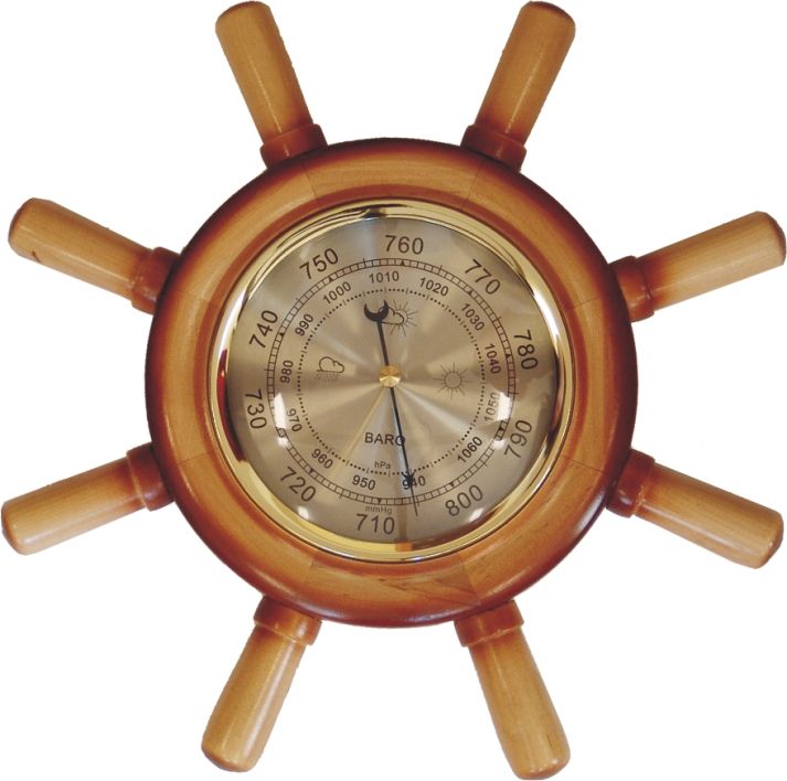 дизайн барометра исполнен в виде штурвала, материал корпуса - натуральное дерево массив. В результате получился не только точный измерительный прибор, но и очень стильный предмет декора.