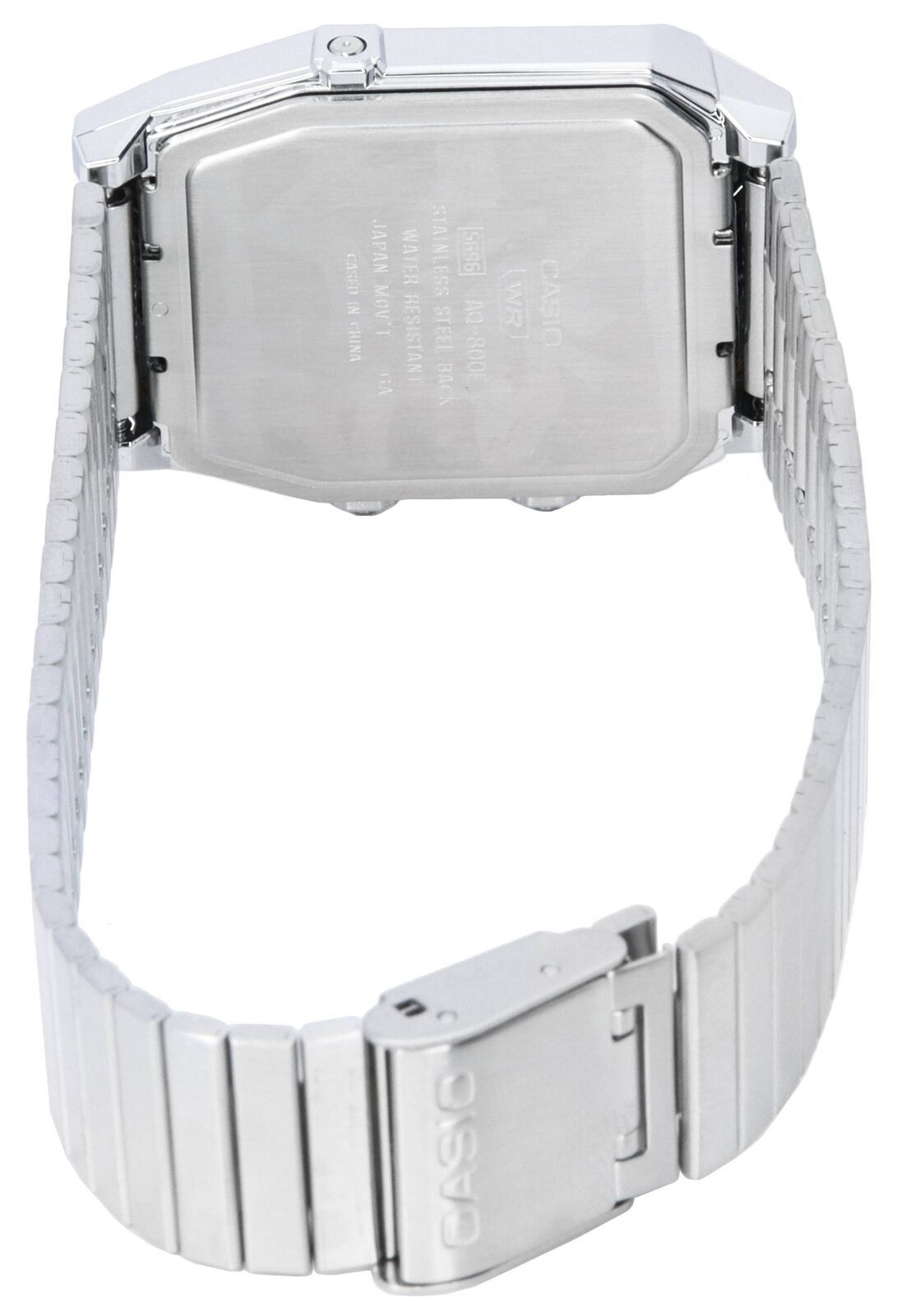 Перед вами стильная и необычная унисекс модель из серии CASIO VINTAGE в пластиковом корпусе AQ-800 с металлическим покрытием серебристого оттенка на стальном браслете. Циферблат модели поделен на 2 части: верхняя основная часть циферблата белого цвета с принтом по "миллиметровку" отображает стрелочное время, а в нижней части находится небольшой дисплей с цифровой индикацией.