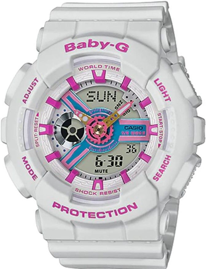 Редкая женская лимитированная модель CASIO BABY-G из серии BA-110 в светлом корпусе с яркими розовыми деталями циферблата.
