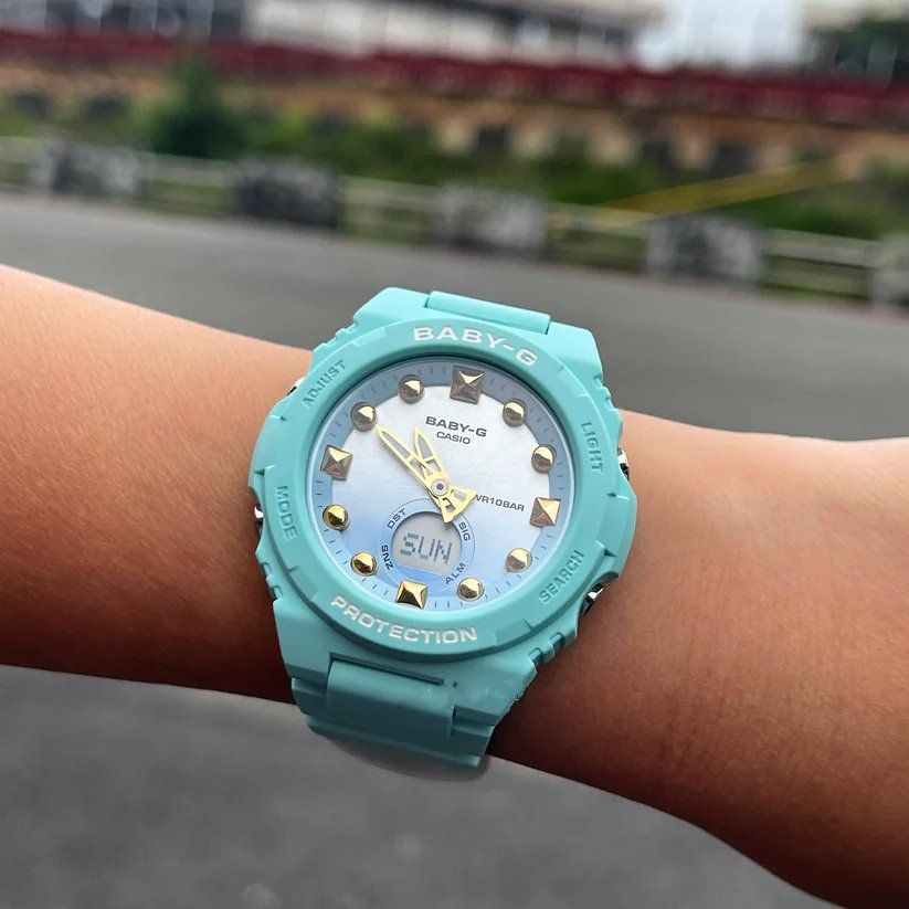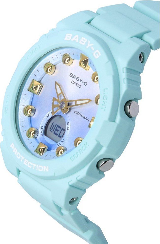 Новинка из женской серии BABY-G BGA-320 в стильной и лаконичной мятной расцветке! Модель выполнена в светло-бирюзовом матовом корпусе на полимерном ремешке, а циферблат часов с деталями цвета розового золота защищен прочным минеральным стеклом.