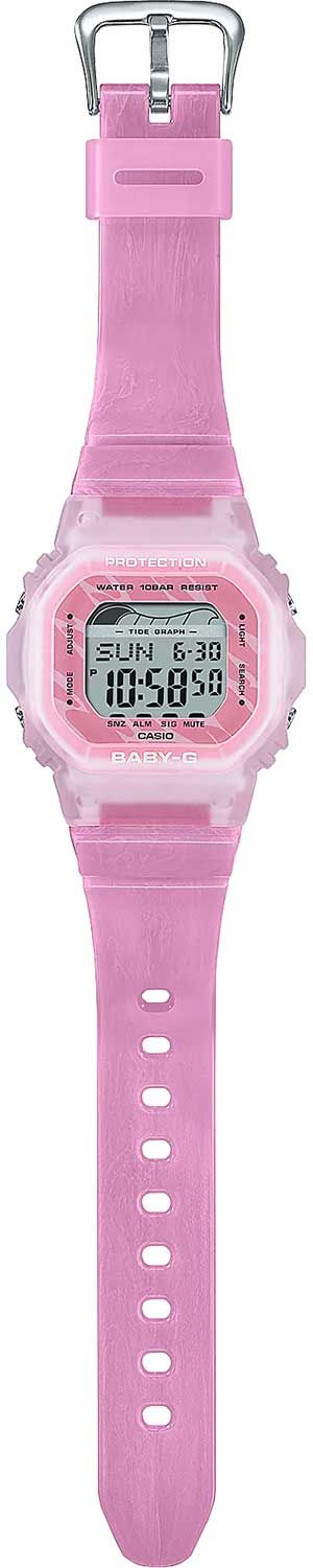 Женская цифровая модель BABY-G второй половины 2022 года из серии G-LIDE в розовом полупрозрачном корпусе BLX-560. Напоминаем, что серия G-LIDE создана для любительниц серфинга, поэтому в данной модели вы найдете информацию о фазах Луны и график приливов и отливов для поиска лучшей волны.
