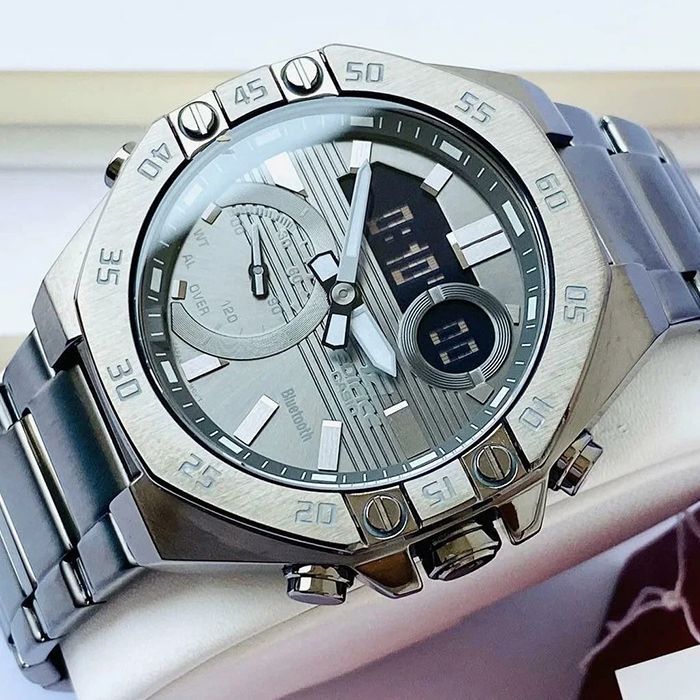 Перед вами лимитированный релиз — хронограф Casio Edifice 2020 года из серии ECB-10 в стальном корпусе графитового оттенка с металлизированным циферблатом, контрастными стрелками и инверсионным дисплеем.