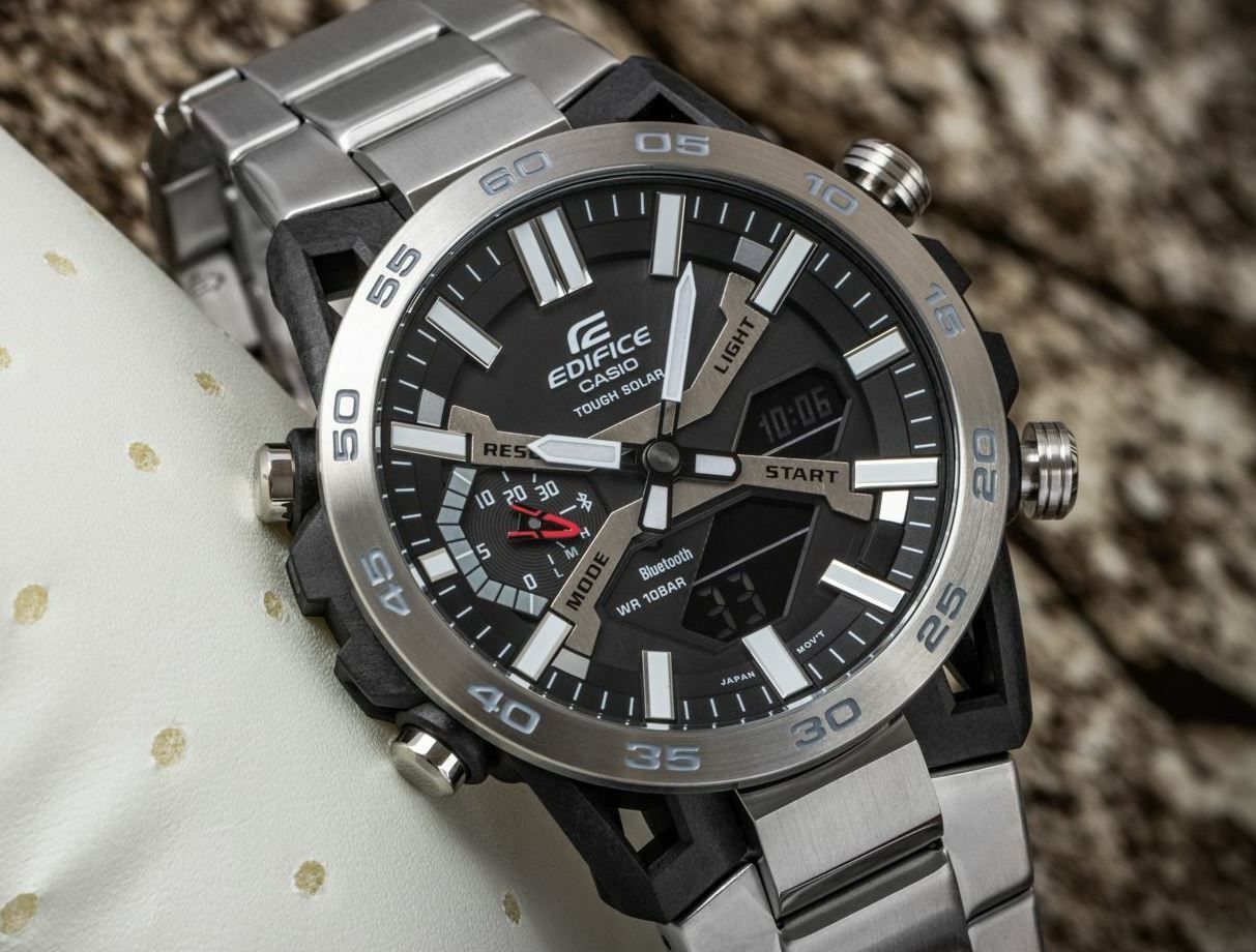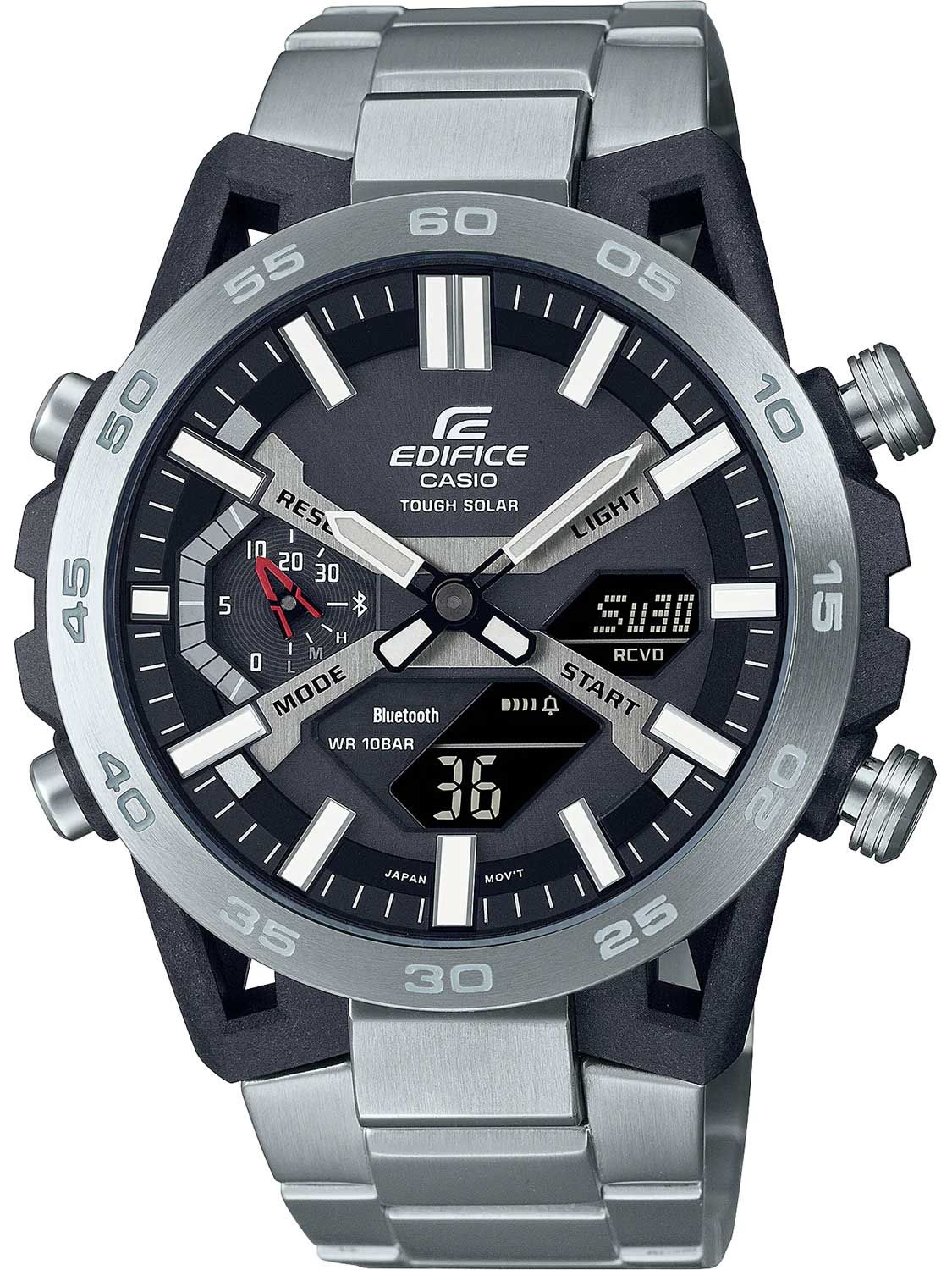 Супер стильный релиз в коллекции Edifice 2022 года из топовой аналого-цифровой серии ECB-2000 в усиленном карбоном корпусе с черным циферблатом, покрытым минеральным стеклом и стальным безелем.