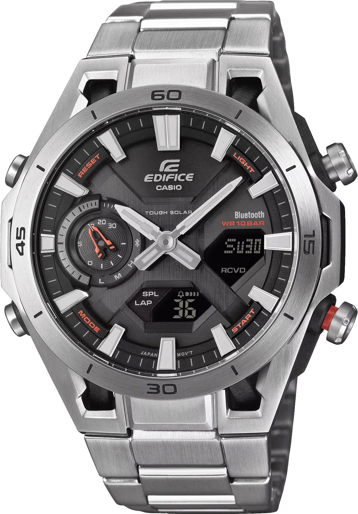 Модель получила стильный и эргономичный многоуровневый циферблат, который сочетает в себе индикацию времени с помощью контрастных стрелок, два цифровых инверсионных дисплея и стрелочный ретроградный указатель оранжевого цвета у отметки девяти часов.