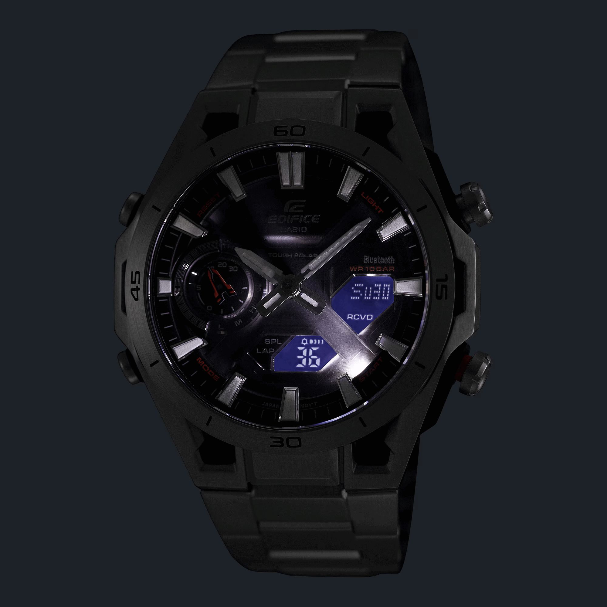 Стоит отдельно отметить наличие в модели солнечной батареи, водозащиты в 10 бар, функции мирового времени, секундомера и таймера обратного отсчета, пяти ежедневных будильников и ежечасного сигнала, возможность отображения текущего дня недели на русском языке. Все это японские инженеры сумели уместить в корпусе толщиной в 10.9 миллиметров.