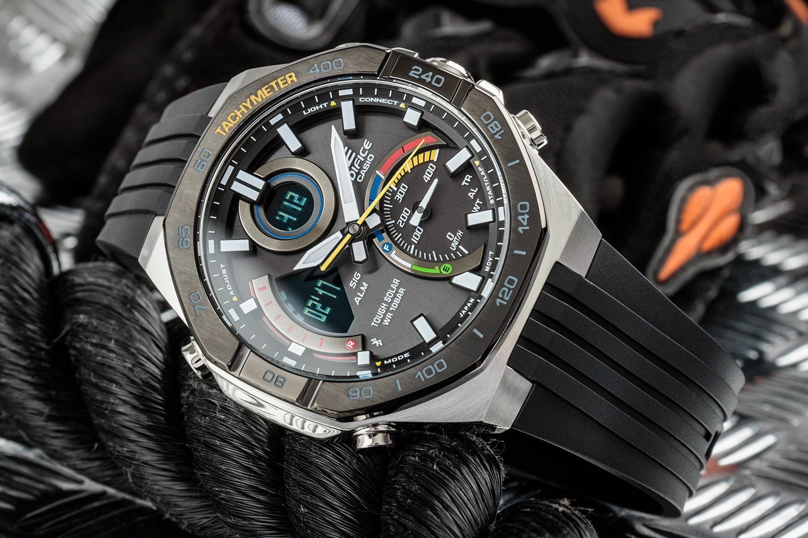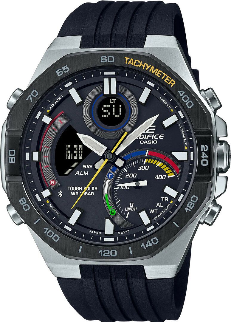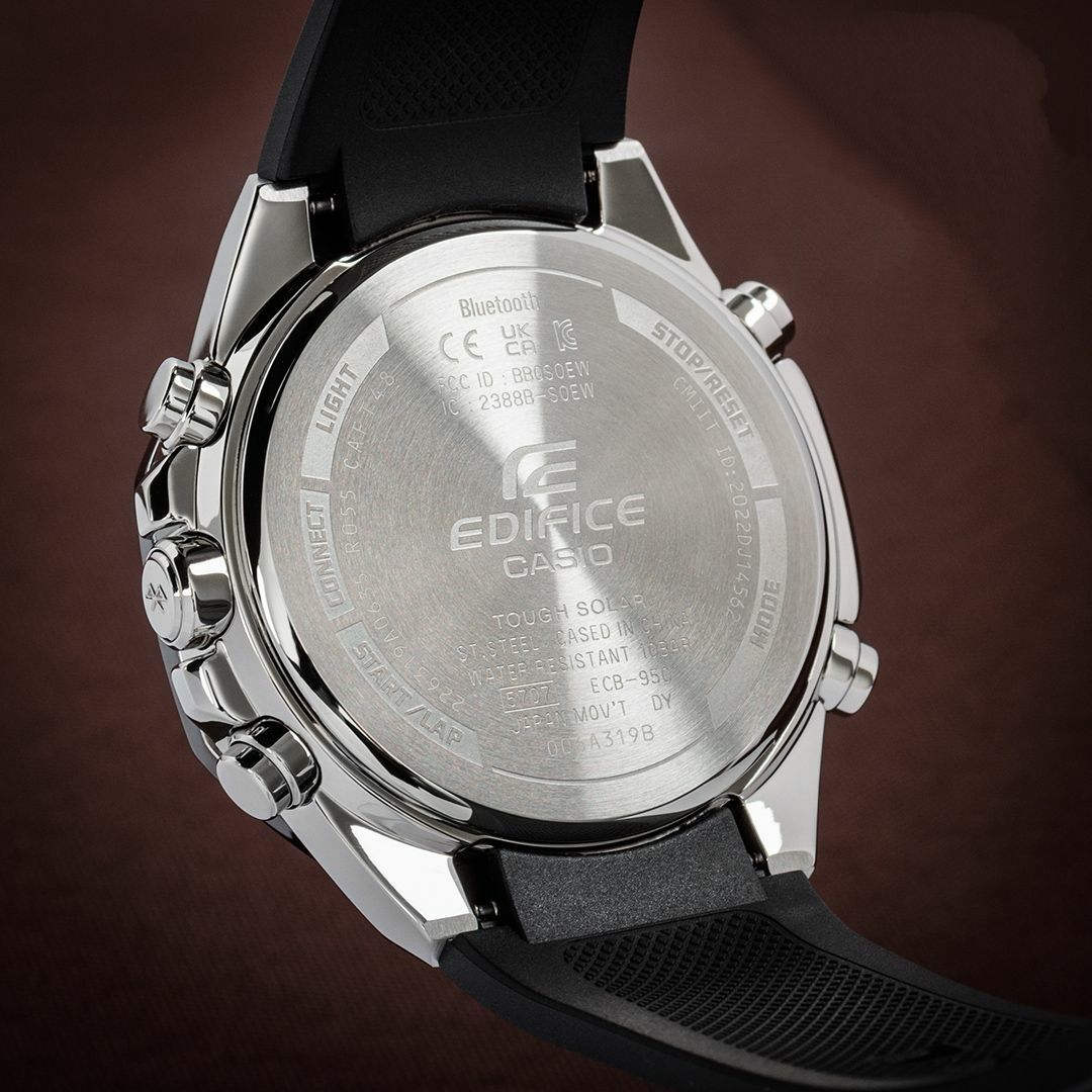 Перед вами стильная редкая лимитированная модель EDIFICE из аналого-цифровой серии Edifice ECB в корпусе ECB-950. Модель обладает новым динамичным дизайном с визуальными отсылками к автомобильному спорту: стальной октагоновый корпус защищает модуль часов от внешних повреждений, харизматичный циферблат покрыт прочным минеральным стеклом и темным стальным безелем с IP-покрытием, а контрастные стрелки обеспечивают высокую эргономику модели.