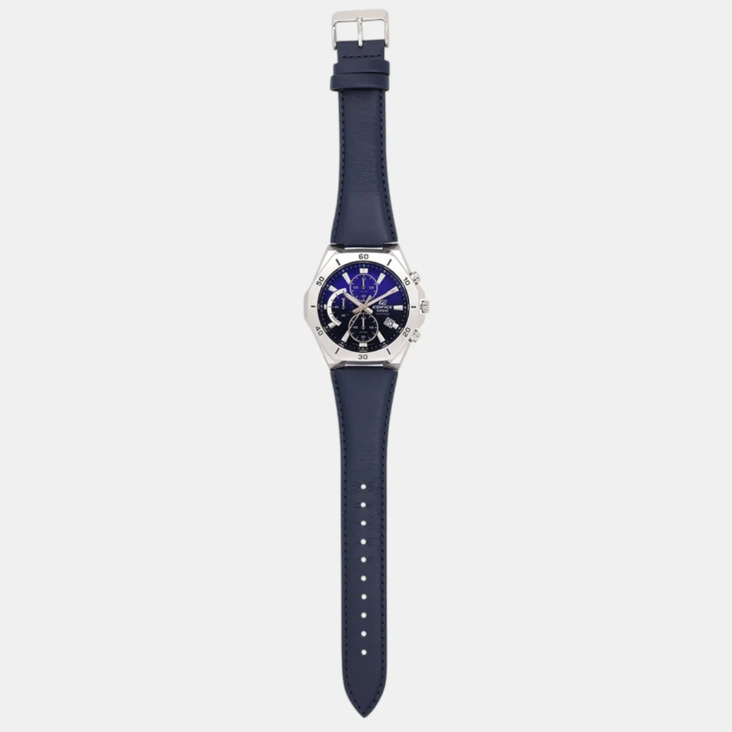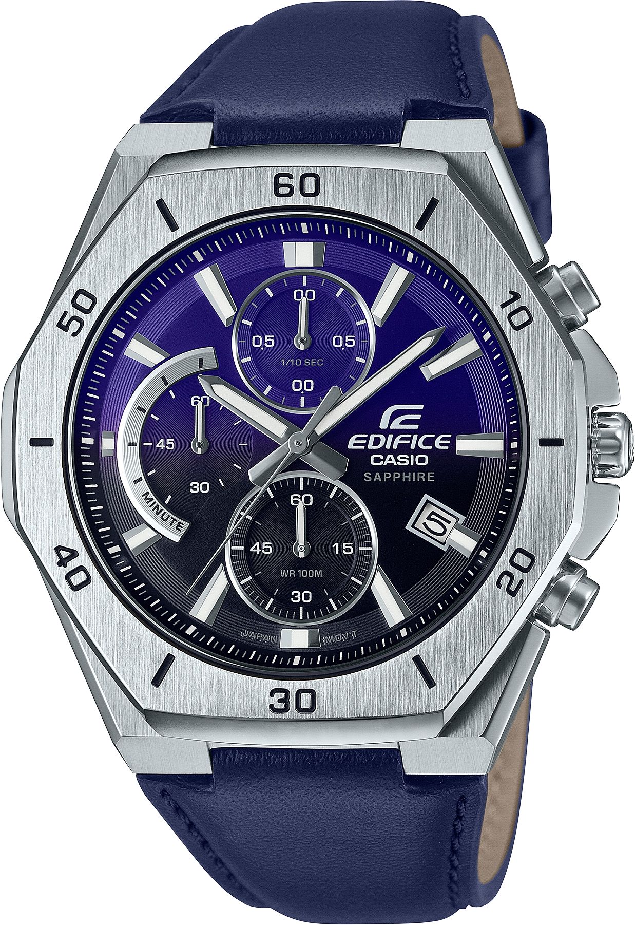 релиз 2025 года в коллекции Edifice из серии EFB-680 в стальном корпусе в форме октагона с градиентным черно-синим циферблатом, покрытым сапфировым стеклом! Модель представляет собой стильный и сбалансированный хронограф с водозащитой в 10 Бар, сапфиром, необрайтовой подсветкой, отображением текущей даты, секундомером на один час и батарейкой на 3 года. Отличный стальной релиз от Casio в новом тренде Edifice к тонким лаконичным моделям со спортивным характером.