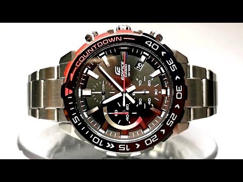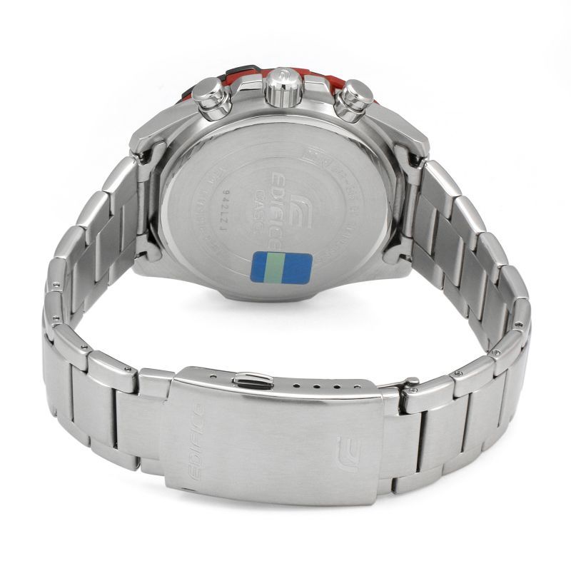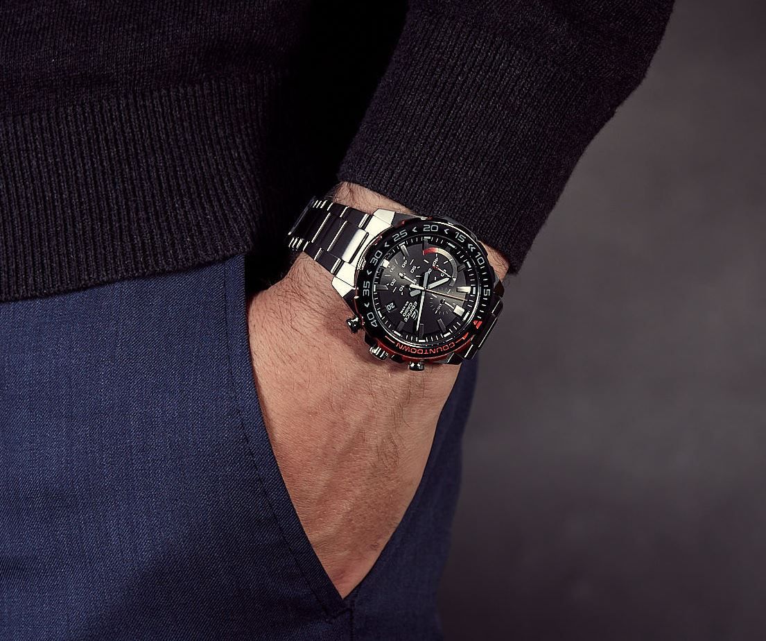 крупный хронограф из серии EFR-566 на стальном браслете с черным циферблатом и яркими красными деталями. Модель отличает внушительные размеры и спортивный автомобильный дизайн.