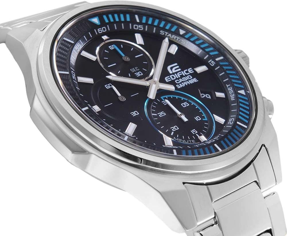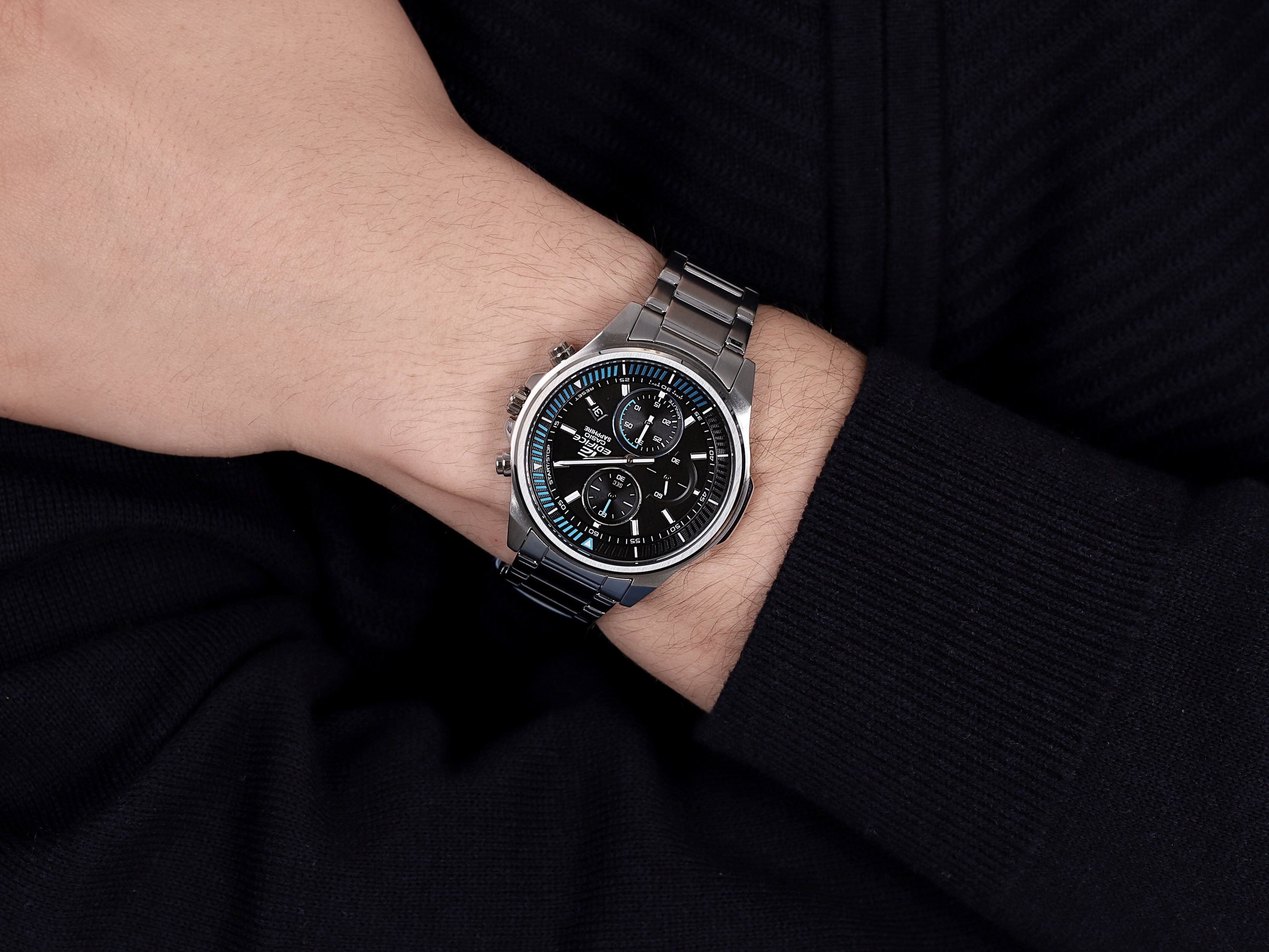 Элементы дизайна EFR-S572 напоминают о гонках, вдохновляющих бренд EDIFICE. Так, безель циферблата, стилизованный под тормозной диск с насечками, подчёркивает автоспортивный характер модели.