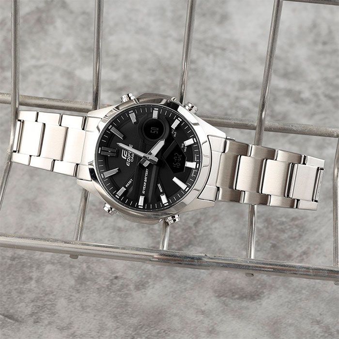 Свежий релиз 2024 года в коллекции Edifice — аналого-цифровой хронограф из серии EFV-C120 в динамичном стальном корпусе на стальном браслете. Прочное закаленное минеральное стекло защищает фактурный черный циферблат с контрастными стрелками от механических повреждений, а на дисплеях часов отображается текущая дата и день недели, а также показатели таймера и секундомера или содержимое записной книжки (вы можете добавить в часы до 30 паролей или важных контактов).