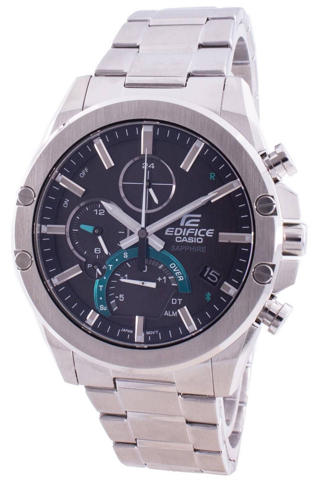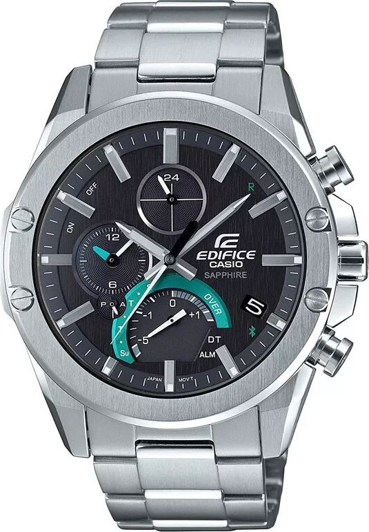 Edifice из серии EQB-1000 в стальном корпусе Особенность модели — невероятно тонкий, по сравнению с другими часами эдифис, корпус толщиной всего в 8.9 мм. В часах используется новый модуль, оснащенный Bluetooth, благодаря чему, часы могут автоматически подключаться к вашему смартфону для синхронизации точного времени, удобной настройки или для быстрого поиска телефона, если он как обычно куда-то пропал (смартфон начнет издавать звуковые сигналы, при нажатии на специальную кнопку на часах).
