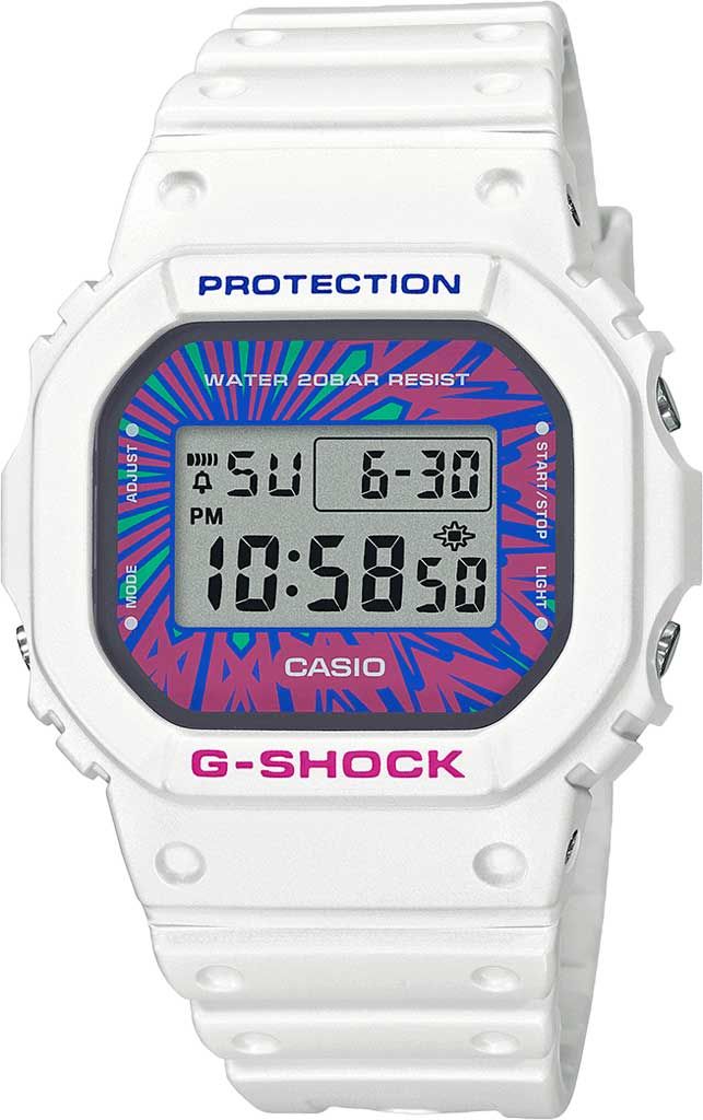 Редкая лимитированная модель 2020 года из олдскульной серии G-SHOCK DW-5600 в белом корпусе с ярким психоделическим абстрактным паттерном вокруг дисплея будет приковывать взгляды и точно не оставит равнодушным никого, в чье поле зрения она попадет.