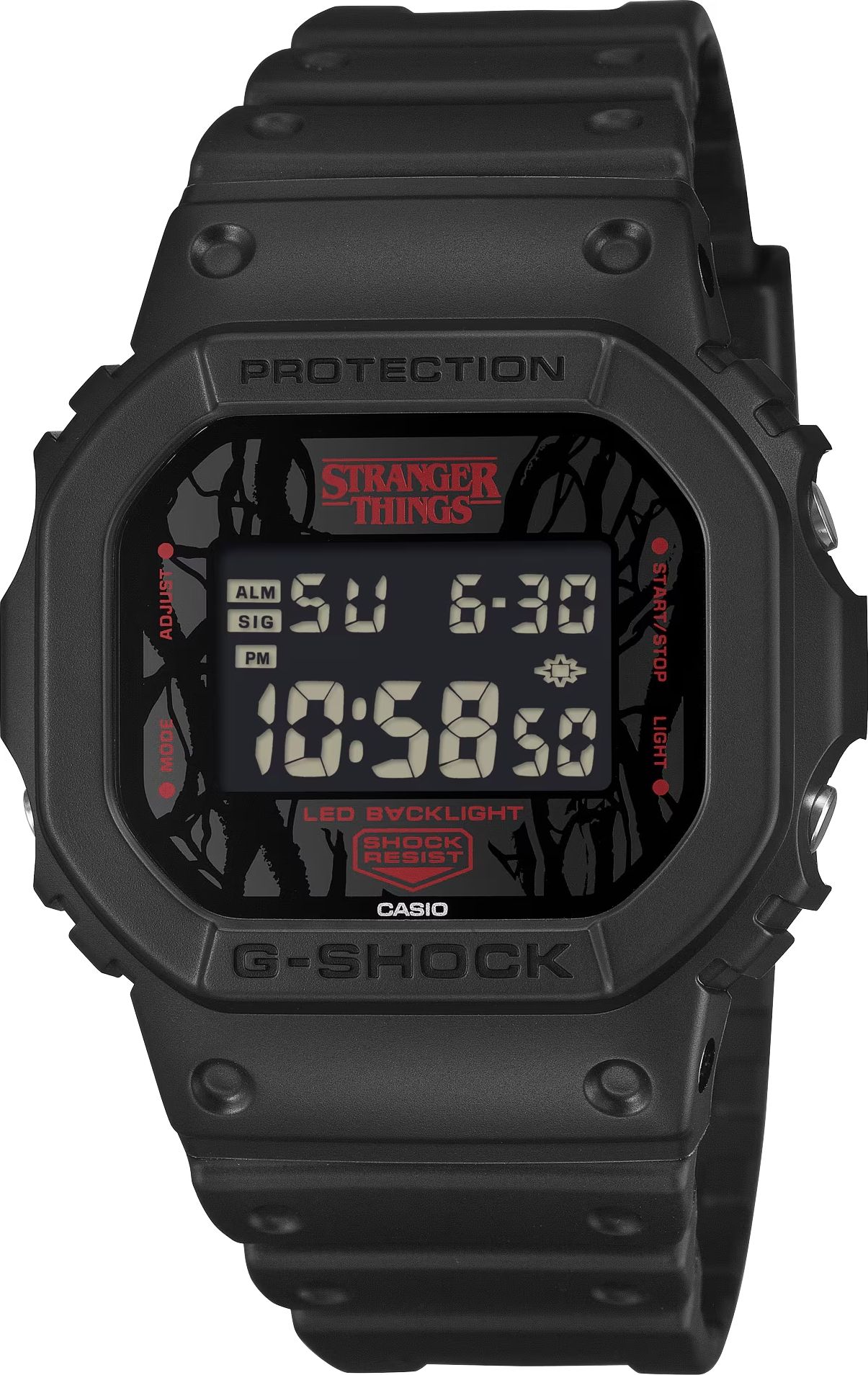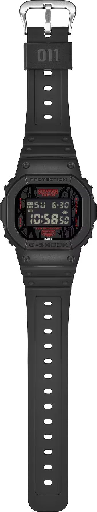 Модель получила харизматичный дизайн с отсылкой к лору и эстетике сериала: на циферблате вы найдете принт в виде колючей лозы и множеством "отростков", символизирующий жуткий мир Изнанки. Буква A в маркировке подсветки «LED BACKLIGHT» перевернута, символизируя параллельное измерение, а сама подсветка выполнена в стильном красном цвете, отражая инфернальную обстановку в Изнанке. И это не все сериальные "пасхалки", спрятанные дизайнерами во внешнем виде модели.