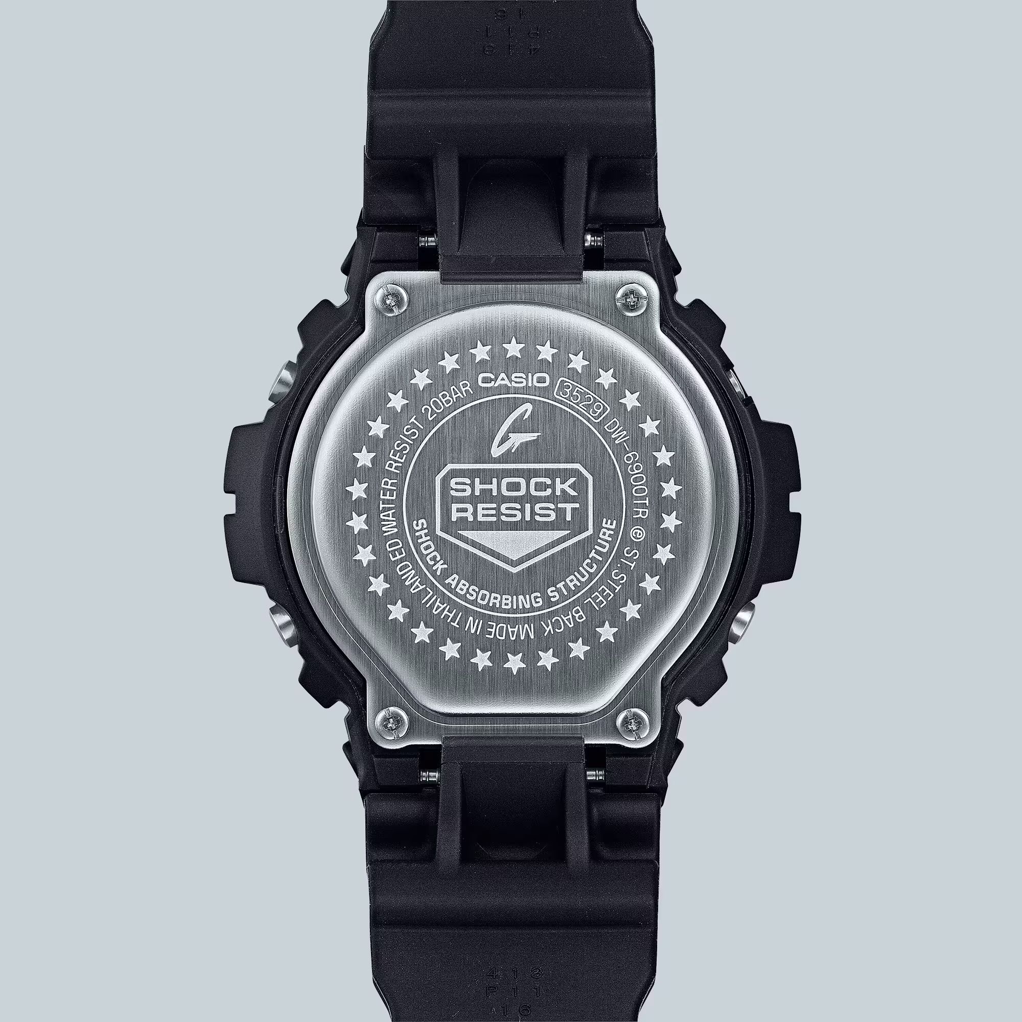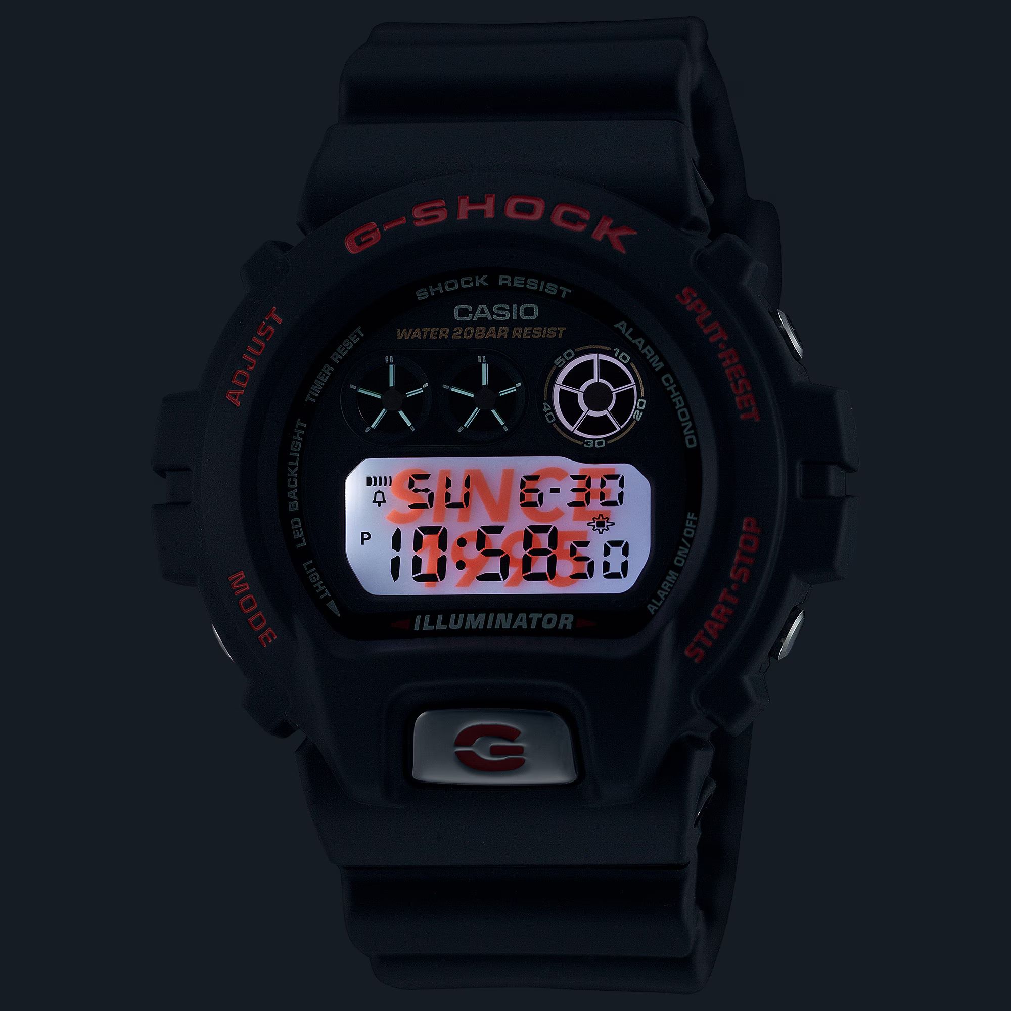 Модель выпущена в рамках юбилейного релиза: в 2025 году цифровой серии джишок DW-6900 исполняется 30 лет. Именно в далеком 1995 году "трехглазки" впервые появились на свет. Часы получили юбилейную гравировку задней крышки с тридцатью звездами, металлическую кнопку подсветки, которая при нажатии отображает фразу "Since 1995" на дисплее и уникальный дизайн упаковки.