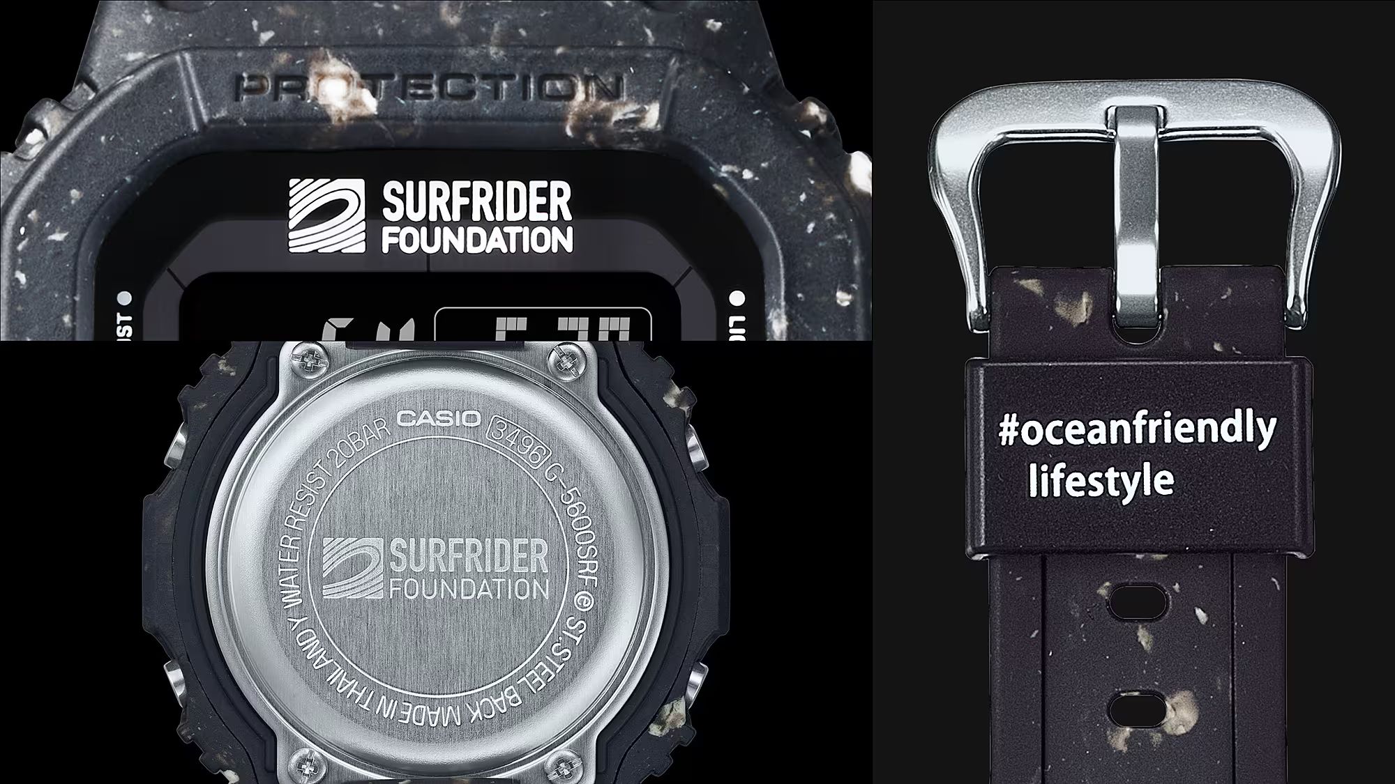 Коллаборация получила олдскульный джишоковый корпус G-5600 прямиком из 1987 года в черном оттенке с инверсионным дисплеем и необычным абстрактным принтом со светлыми вкраплениями. Подобный эффект был достигнут из-за использования переработанного полимера, который вместо утилизации был использован повторно для создания корпуса и ремешка часов, снижая таким образом нагрузку на окружающую среду.