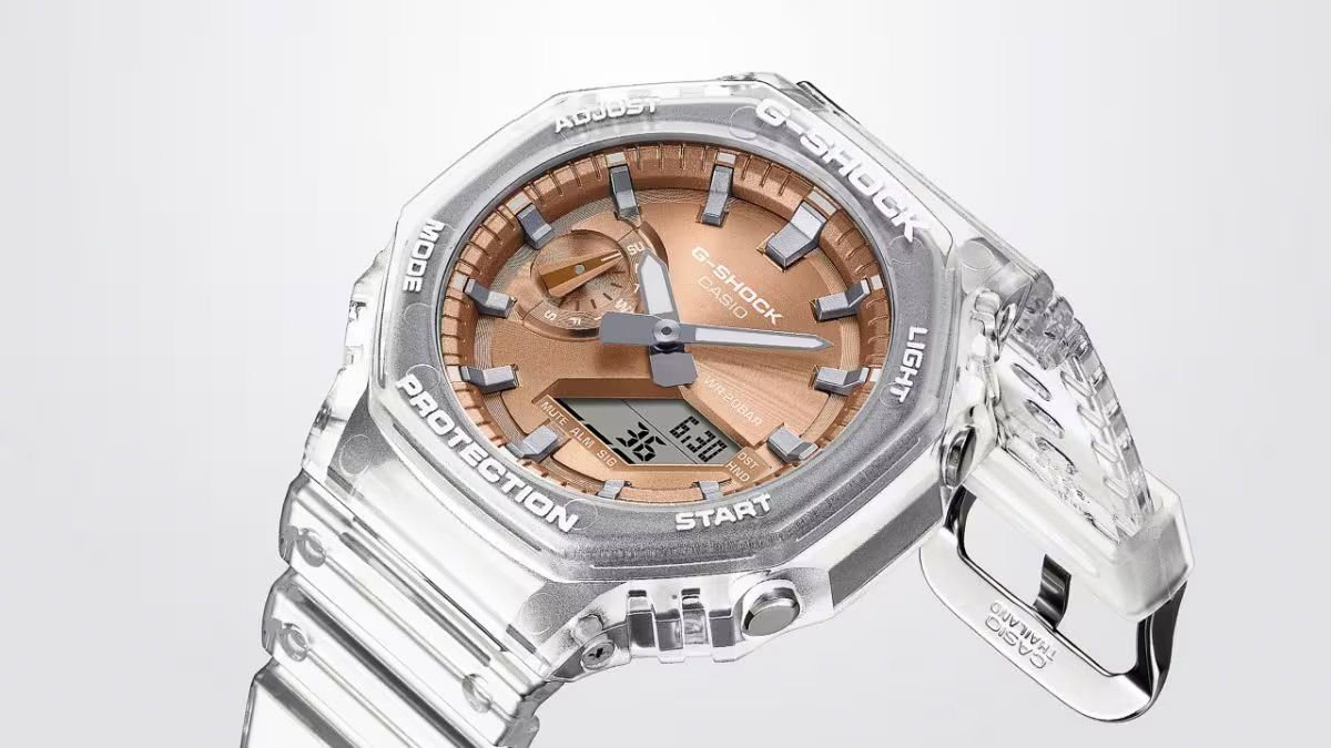 джишоки 2025 года в полупрозрачном белом корпусе GA-2100 в форме октагона с ярким циферблатом цвета розового золота. Модель отличается среди других джишоков своей легкостью, компактностью и толщиной корпуса всего в 11.8 мм! Это стало возможным благодаря технологии Carbon Core Guard: модуль часов защищает легкий и сверх-прочный полиуретановый корпус с углеродным армированием, а циферблат покрыт закаленным минеральным стеклом.