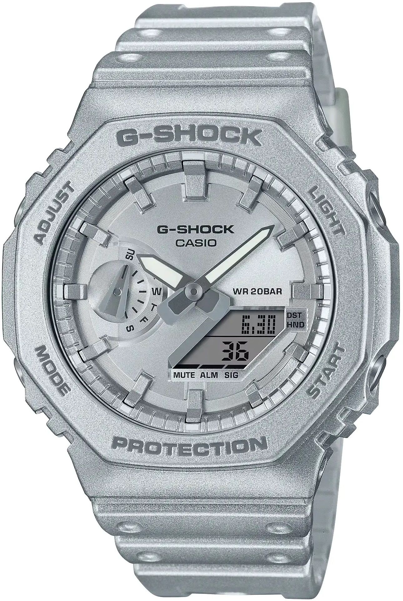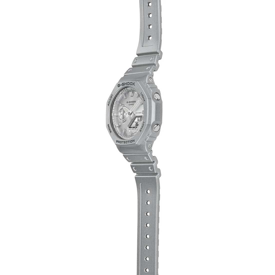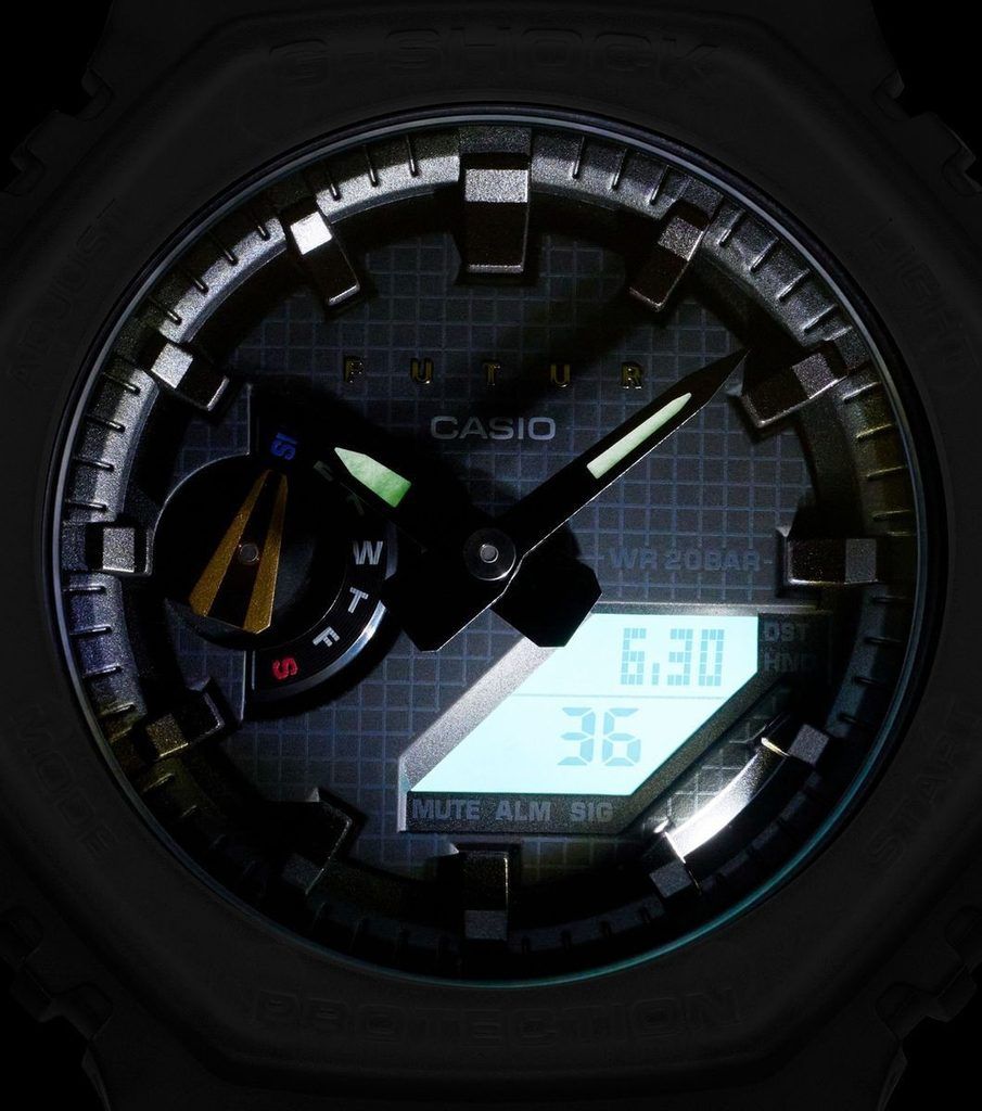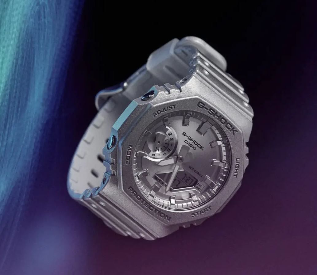 релиз 2023 года — “назад в будущее” в октагоновом корпусе GA-2100. Акцент на краске серебристого цвета с эффектом металлик. Очень напоминает научную фантастику, в которой авторы высказывают свой футуристический взгляд на мир. Помните фильм “Назад в будущее” и момент, где главный герой попадает в будущее? На наш взгляд, удачная аналогия с элементами одежды и обуви “завтрашнего” дня. Отчетливый металлик — результат особой техники напыления серебристой краски. Все элементы корпуса и дисплея выполнены в духе футуризма. Дизайн будет хорошо сочетаться с уличной модой и молодежными вкусами.