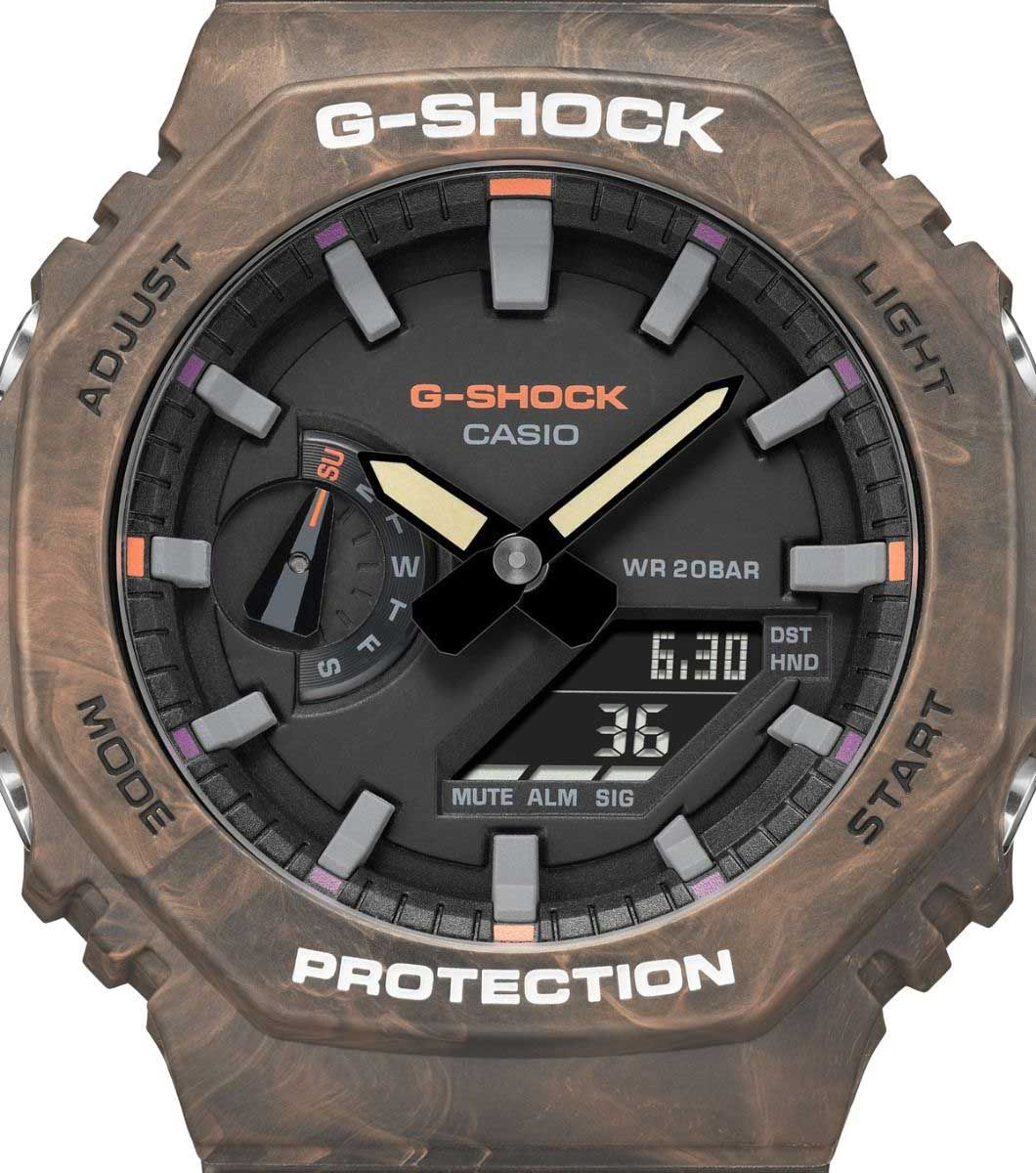 лимитированный релиз конца 2021 года в популярном корпусе GA-2100 в форме октагона в яркой и необычной расцветке "под дерево" коричневого цвета, глядя на которую, каждый может увидеть что-то свое.