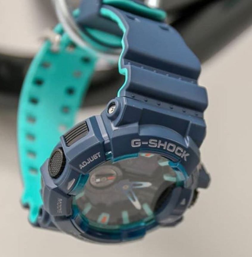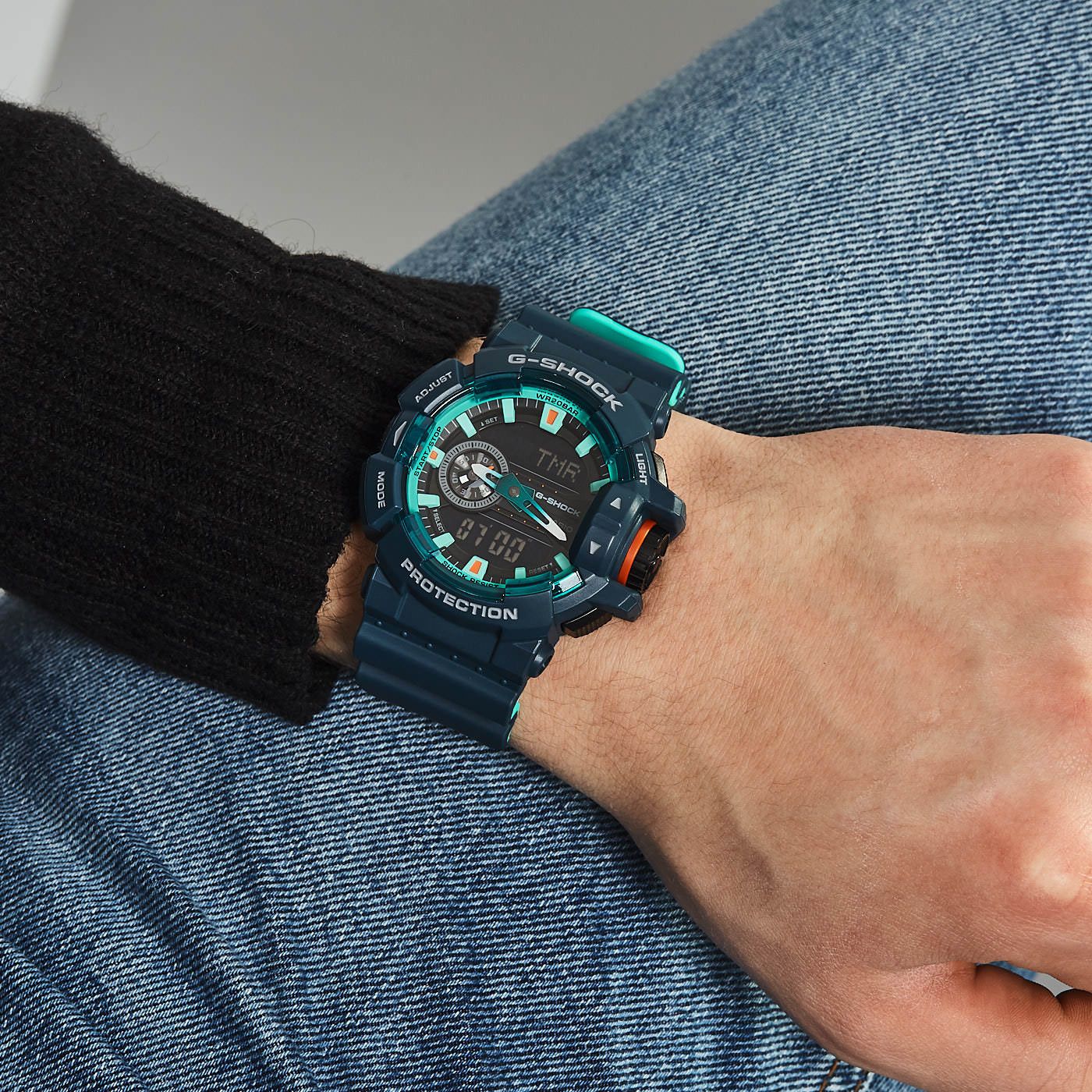 Стильная новинка в синем корпусе c яркими бирюзовыми деталями из серии GA-400. Управление многочисленным функционалом модели осуществляется с помощью эргономичного колеса на торце.