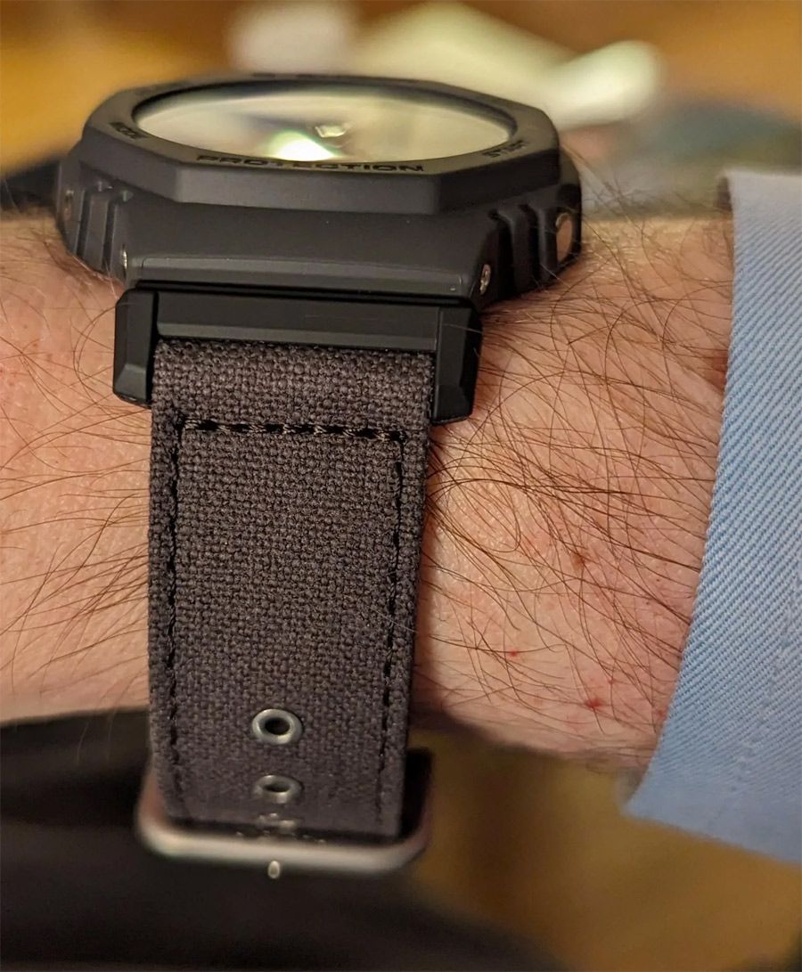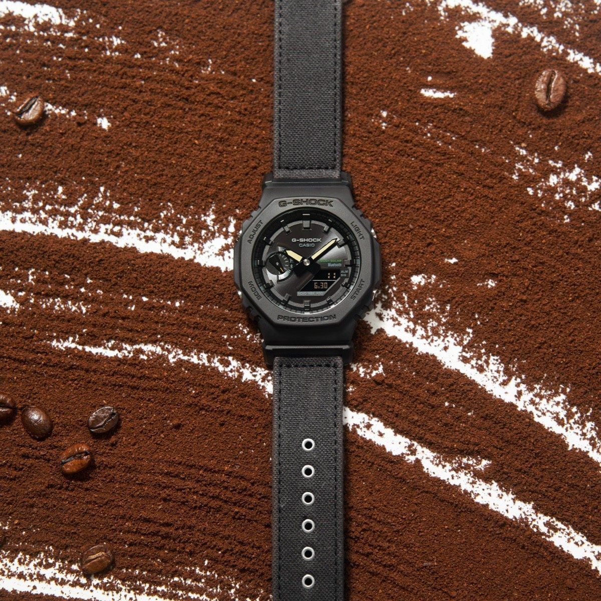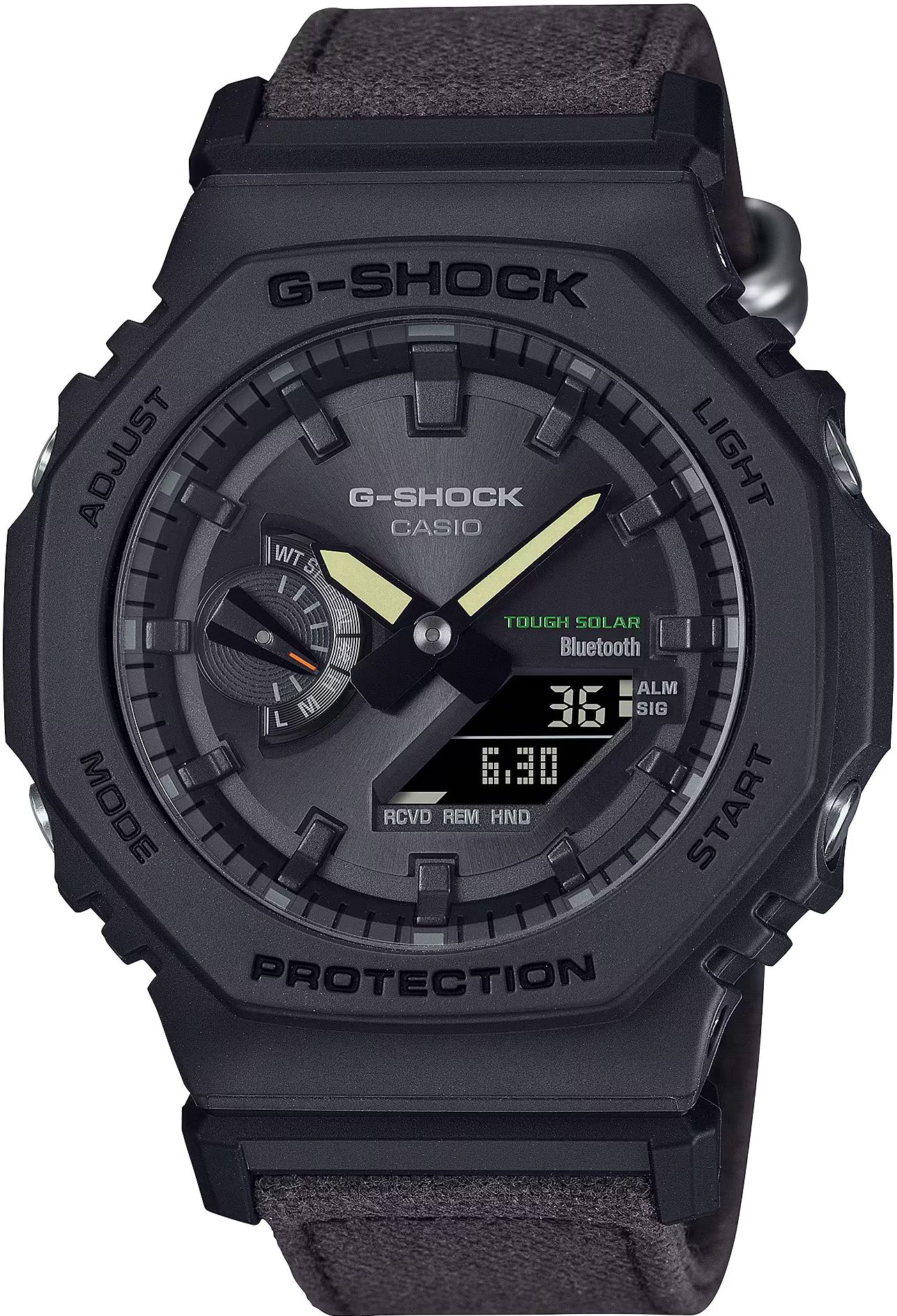 Стильная модель из серии GA-B2100 в матовом октагоновом корпусе черного цвета с контрастными стрелками и текстильным темно-коричневым ремешком сохранила внешний облик своих предшественников по серии GA-2100, но получила более технологичный модуль с блютус синхронизацией со смартфоном и солнечной батареей на борту.