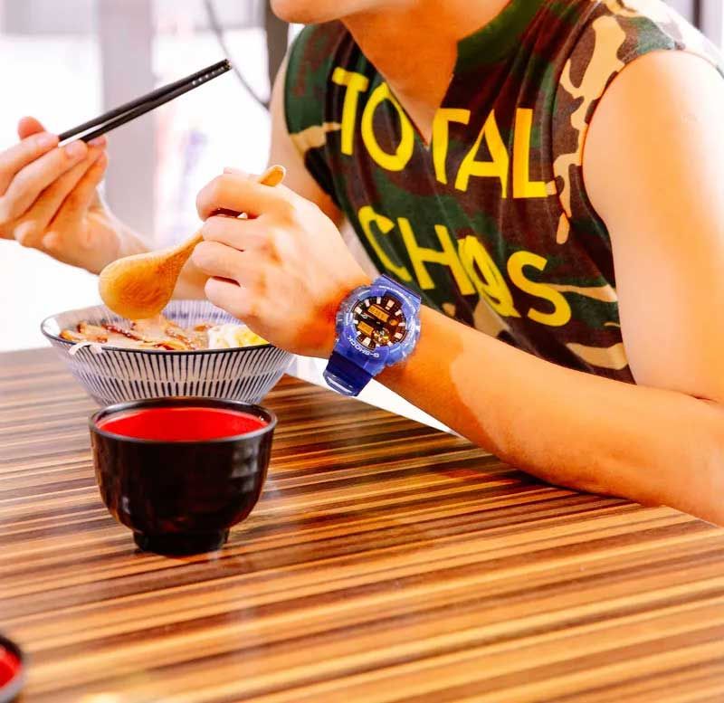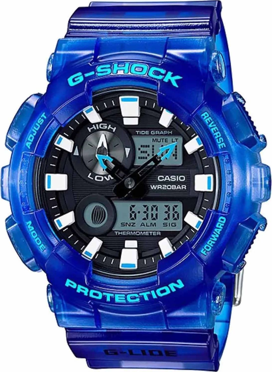 Редкая модель G-Shock из серии G-LIDE в ярко-синем полупрозрачном корпусе GA-100 сочетает привычный корпус "соток" и расширенный функционал серферской серии: отображение графика приливов, фаз Луны, а также встроенный термометр. Без сомнений, модель будет успешна среди людей, увлекающихся водными видами спорта.