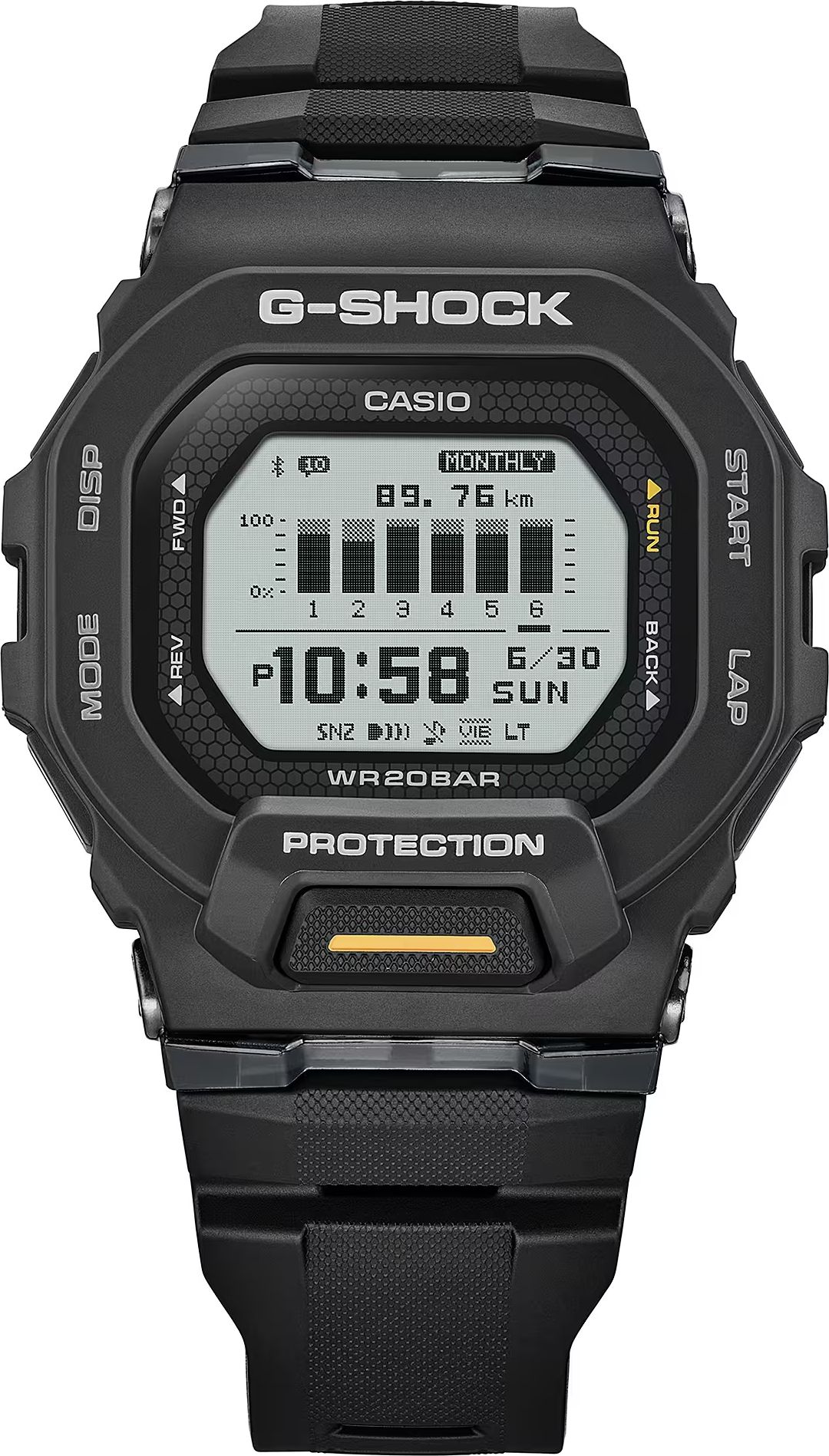 Релиз конца 2025 года — цифровая модель Casio G-Shock из серии GBD-200 в черном матовом корпусе с классическим MIP-дисплеем на полимерном ремешке. Помимо стильного внешнего вида, часы обладают шагомером и функцией Bluetooth. Блютус позволяет удобно отображать все метрики с часов на экране смартфона, а также выводить на часы уведомления о входящих звонках, сообщениях и имейлах.