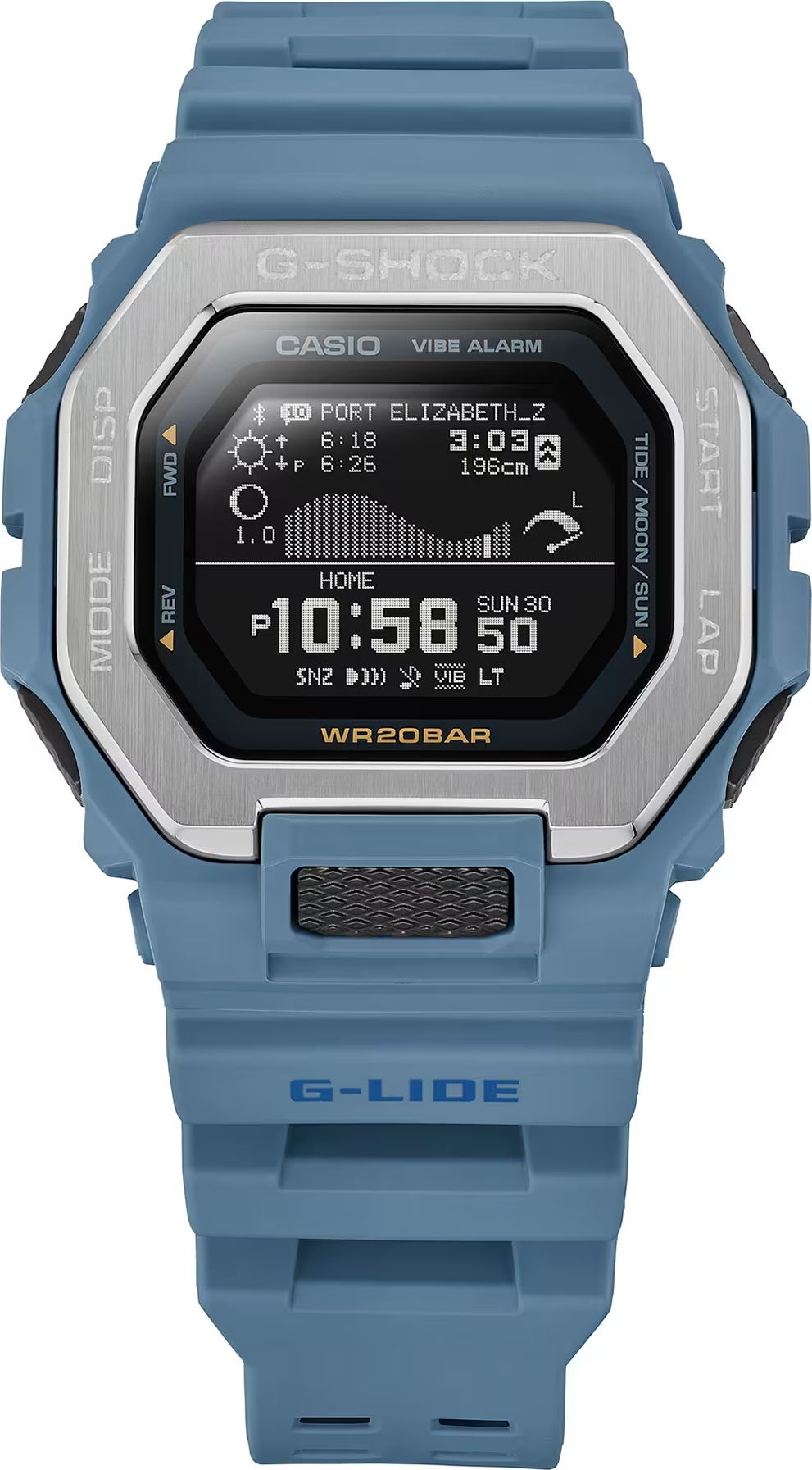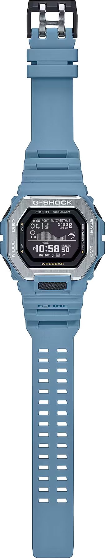Перед вами релиз 2024 года цифровых джишоков в стильном голубом корпусе GBX-100 из серферско-бордерской серии G-SHOCK G-LIDE.