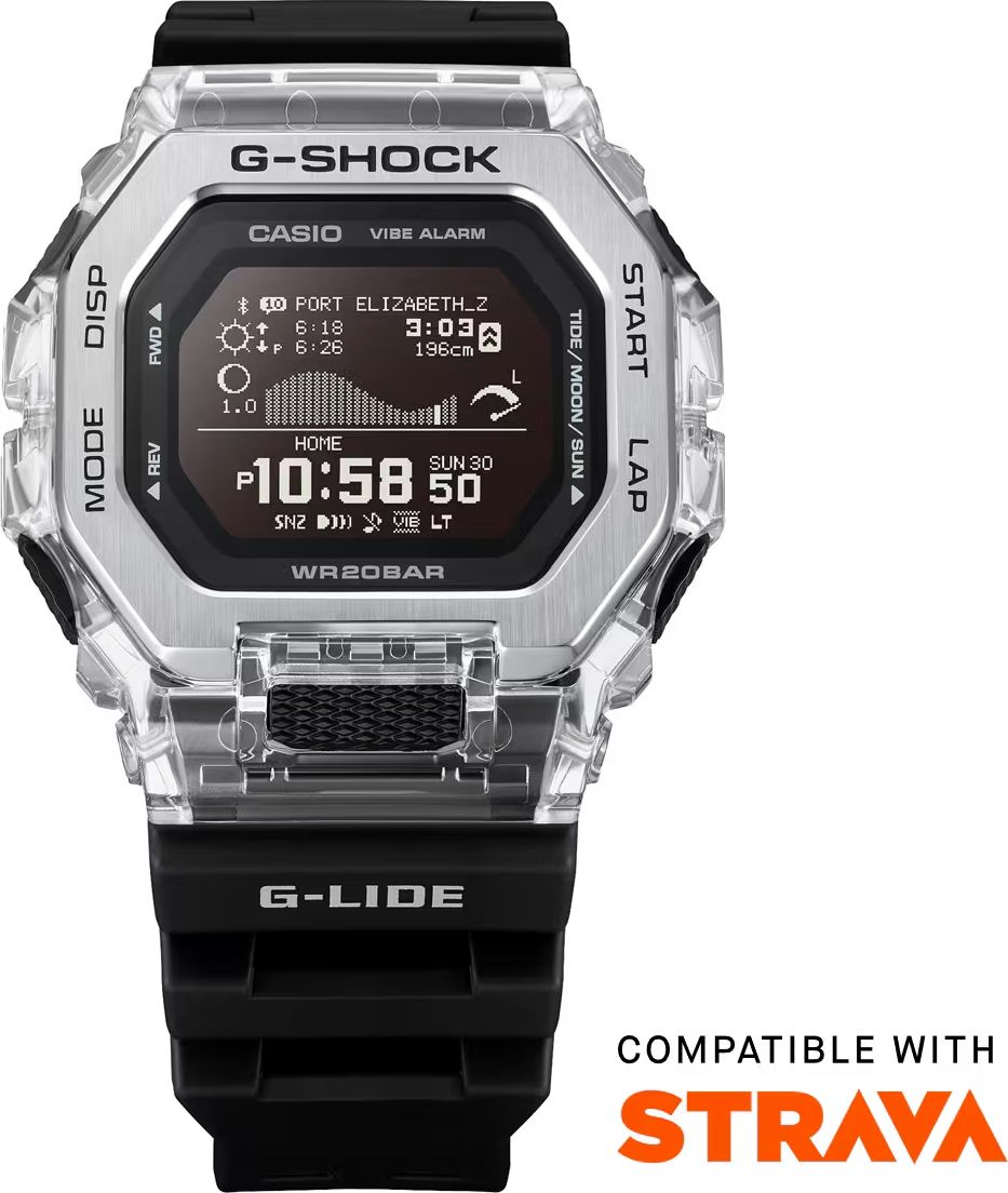 стильная цифровая модель джишок 2025 года в полупрозрачном скелетоновом корпусе GBX-100 на черном полимерном ремешке. Эта модель из серферско-бордерской серии G-SHOCK G-LIDE получила новый информативный MIP инверсионный дисплей, который защищен от повреждений стальным безелем и прочным минеральным стеклом.