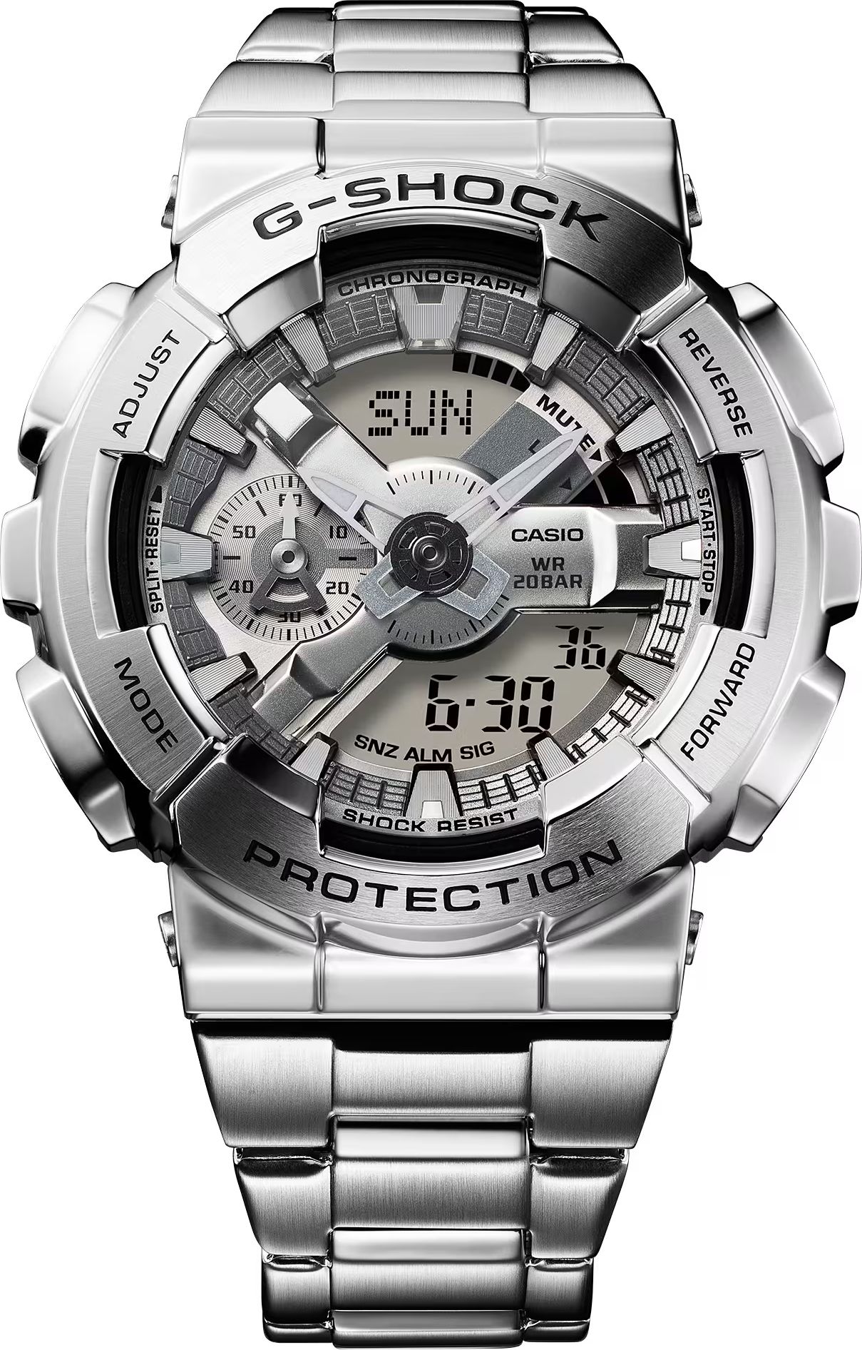 GM-110D, обновленный вариант популярного аналого-цифрового G-SHOCK в большом корпусе с металлическим безелем и ремешком. Высокоточная ковка, резка и полировка, а также специальные технологии формования - все это используется для изготовления металлического безеля с прочным, ударопрочным дизайном, что позволяет создать прочную конструкцию, не снижающую прочность. Корпус изготовлен из высококачественной смолы для защиты модуля. Часы GM-110D-8A с металлическим ремешком, серебристым безелем из нержавеющей стали и циферблатом цвета оружейного металла идеально подходят для работы или развлечений.