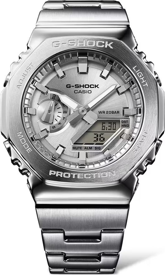 стильный лимитированный релиз 2024 года из серии G-Shock GM-2100 в стальном корпусе в форме октагона на браслете.
