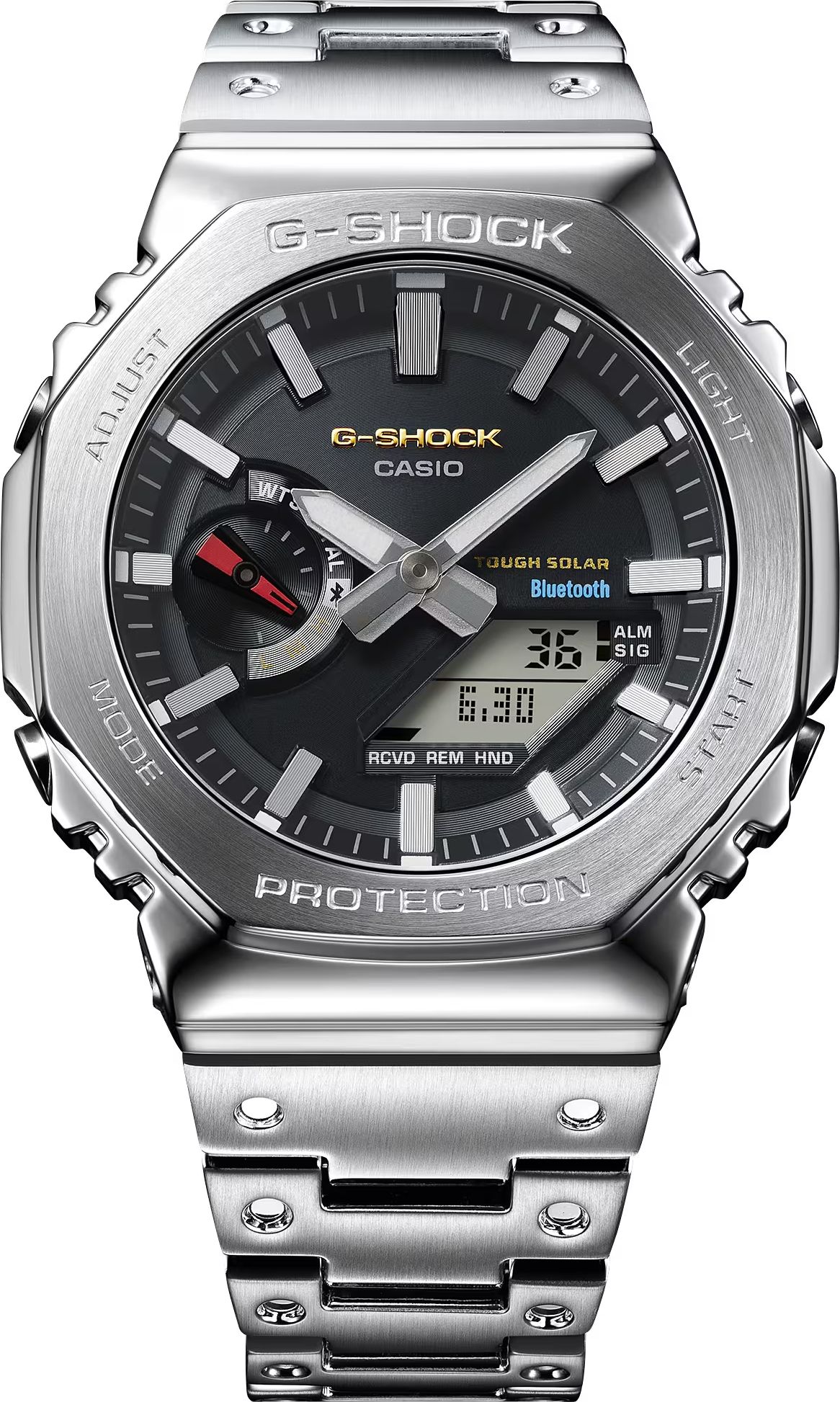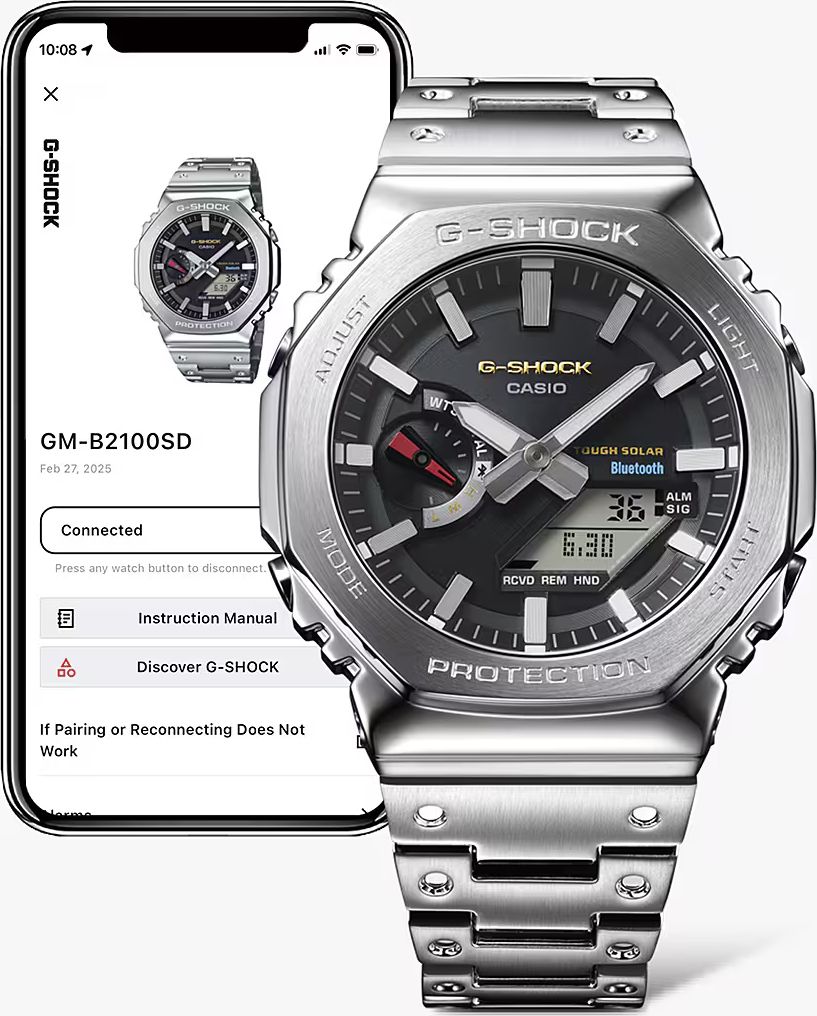 релиз второй половины 2025 года из серии G-Shock GM-B2100 в полностью стальном корпусе в форме октагона и темным циферблатом с контрастными стрелками и небольшими яркими акцентами! Это старший брат популярной полимерной октагоновой серии GA-2100 и мидл-серии GM-2100, которая имеет стальную верхнюю часть корпуса и полимерный ремешок.