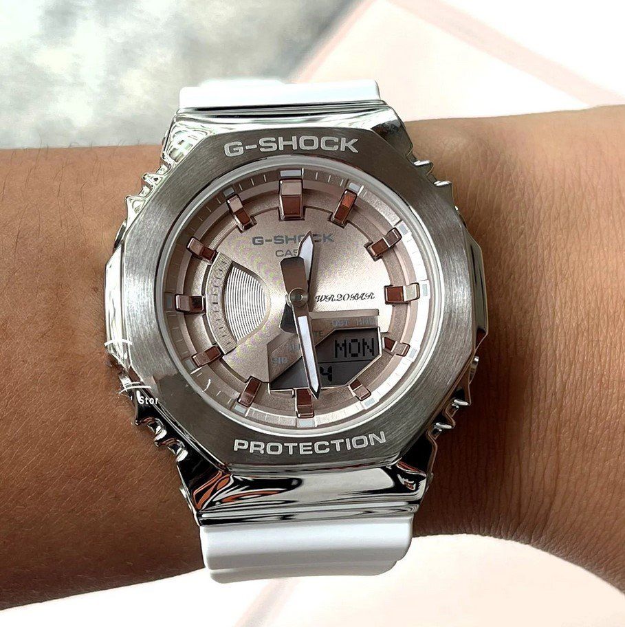 Несмотря на появление металла, эта модель в стальном корпусе на белом полимерном ремешке может похвастать своей легкостью в 55 грамм, компактностью и толщиной корпуса всего в 11 мм, что впечатляет на фоне более массивных собратьев по серии G-Shock.