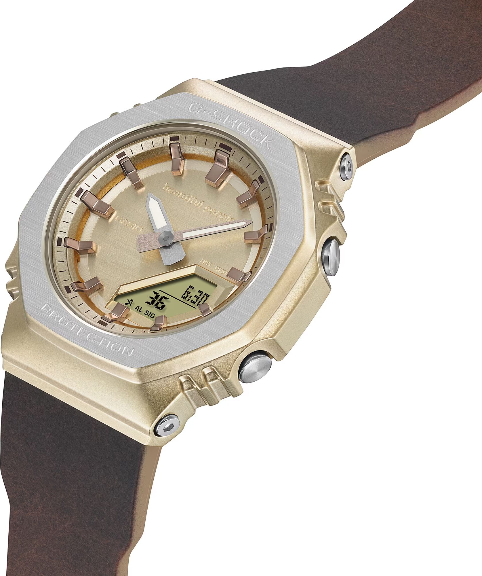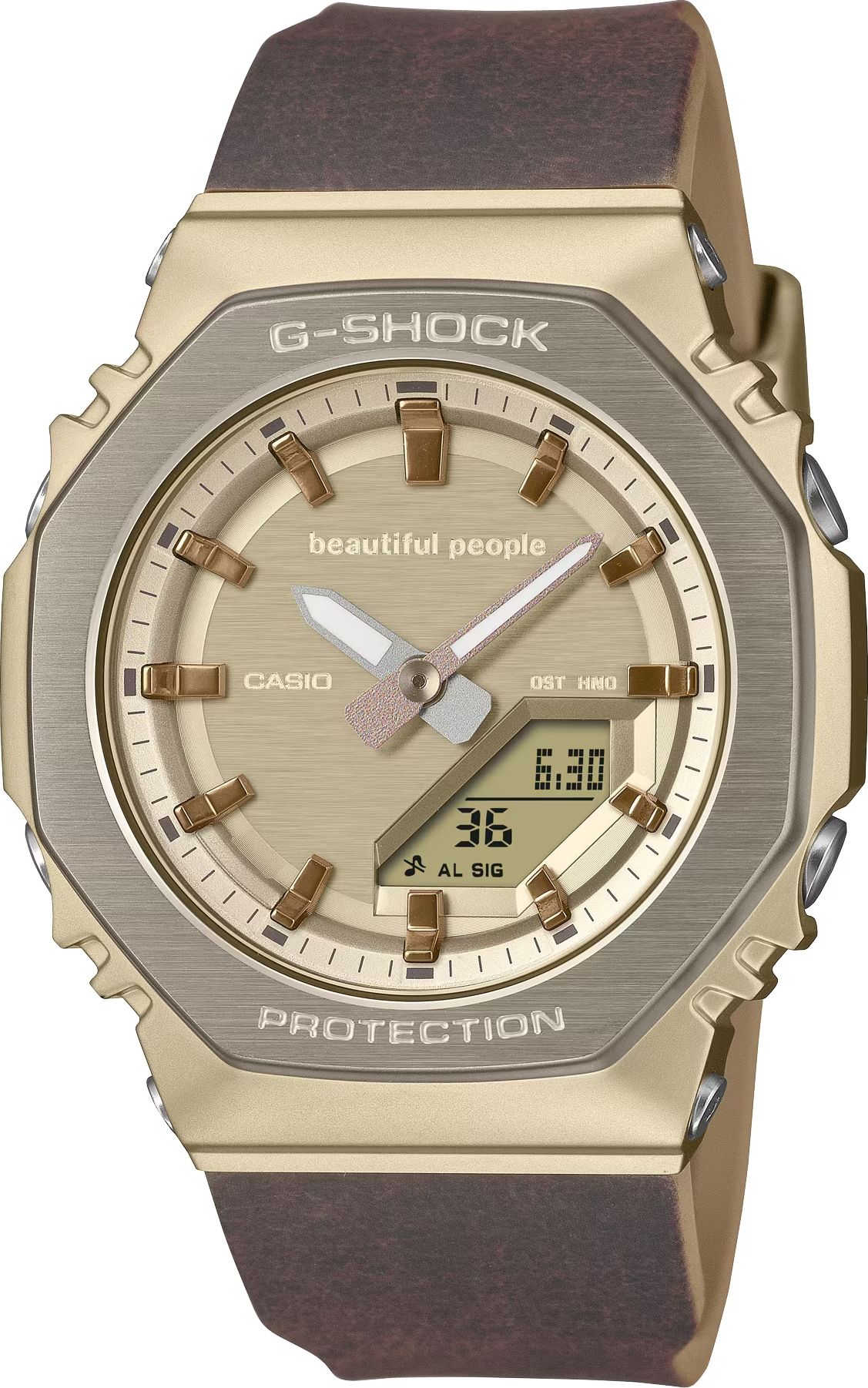 Несмотря на появление металла, эта модель в стальном корпусе цвета золота на биополимерном ремешке может похвастать своей легкостью в 56 грамм, компактностью и толщиной корпуса всего в 11 мм, что впечатляет на фоне более массивных собратьев по серии G-Shock.
