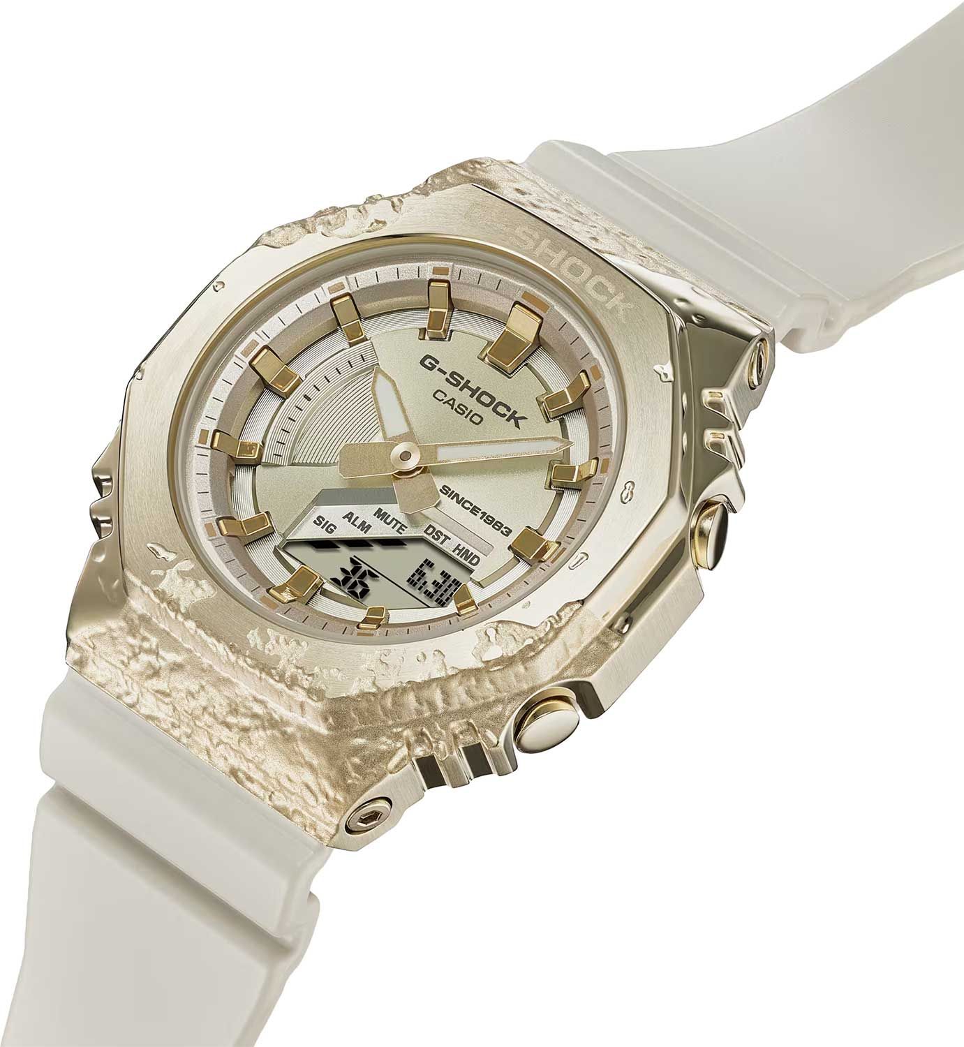 Несмотря на появление металла, эта модель в стальном корпусе золотого цвета на светлом полимерном ремешке может похвастать своей легкостью в 58 грамм, компактностью и толщиной корпуса всего в 11 мм, что впечатляет на фоне более массивных собратьев по серии G-Shock.
