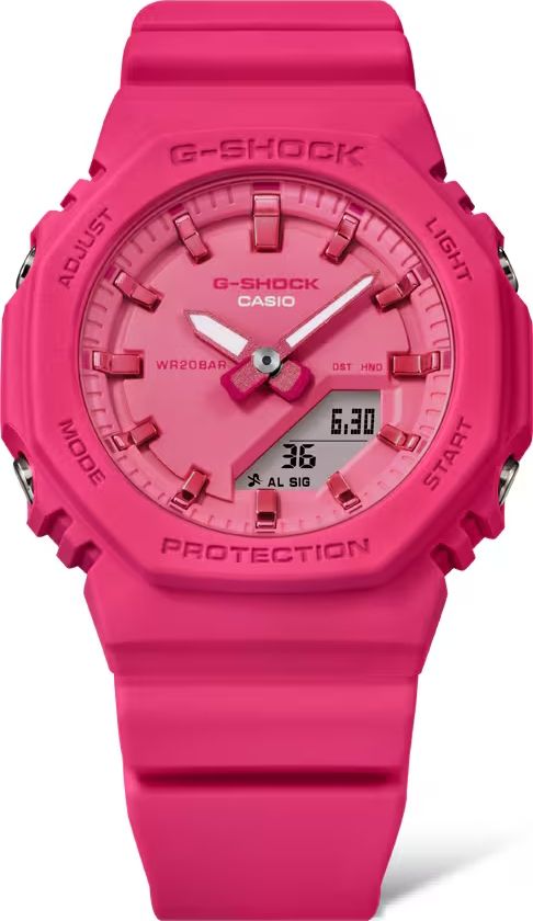 яркие женские джишоки 2025 года из свежей серии G-SHOCK GMA-P2100 в октагоновом корпусе розового оттенка на полимерном ремешке.