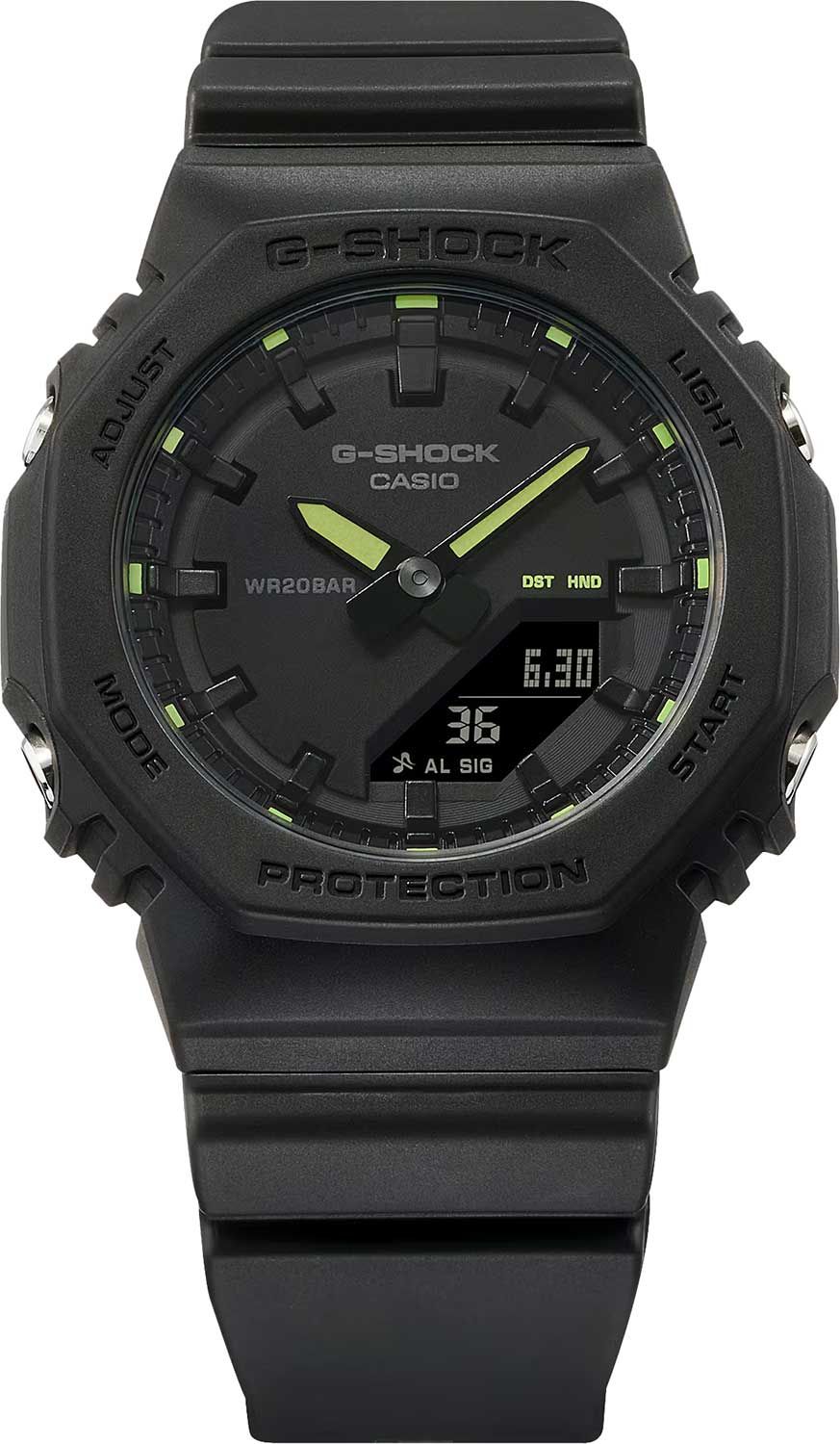 Стильная и лаконичная компактная унисекс модель 2025 года из свежей серии G-SHOCK GMA-P2100 в полностью черном октагоновом корпусе на полимерном ремешке с яркими желто-зелеными деталями циферблата. Модель является уменьшенным вариантом часов из мужской серии джишоков GA-2100, что позволяет ей оптимально выглядеть даже на самых небольших и изящных женских запястьях. Толщина модели всего 11.2 миллиметра, что на момент ее выхода является абсолютным рекордом среди всех джишоков!