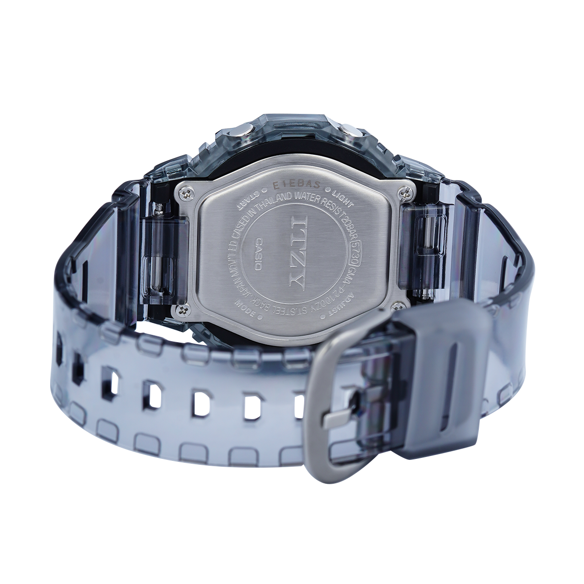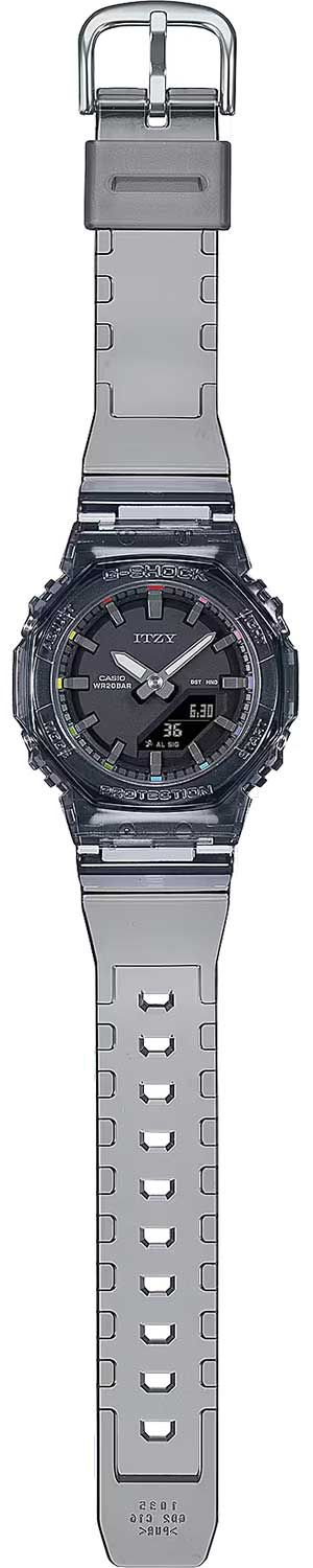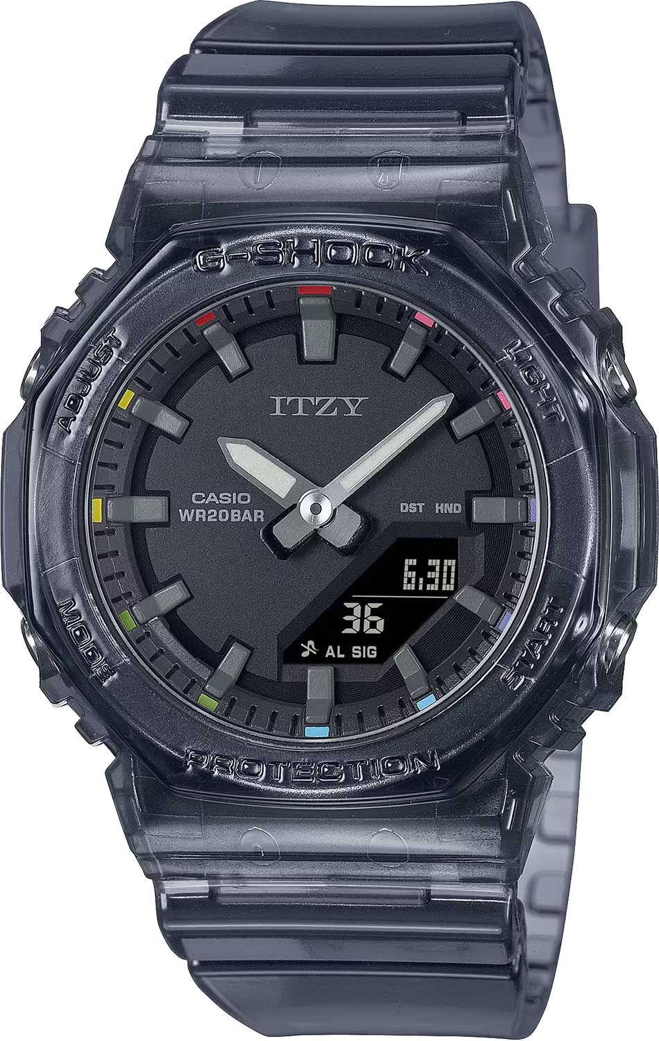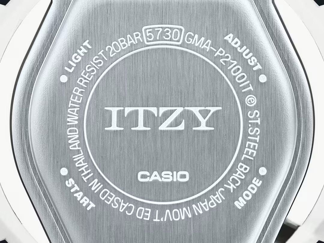 Стильная унисекс модель 2024 года из свежей серии G-SHOCK GMA-P2100 в темном полупрозрачном октагоновом корпусе и полимерном ремешке является коллаборацией бренда G-Shock и Itzy — популярной южнокорейской гёрл-группы жанра K-pop. Логотип группы Itzy украшает циферблат часов, выгравирован на задней крышке, а на фирменной коробке часов вы найдете автографы всех 5 участниц группы. Всего данная коллаборация насчитывает 3 совместные модели.