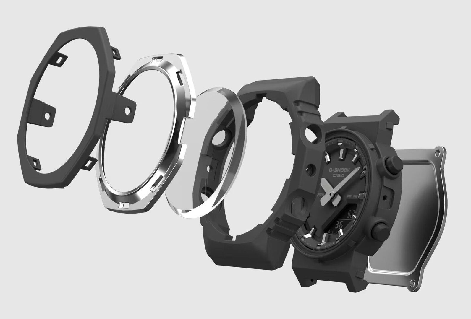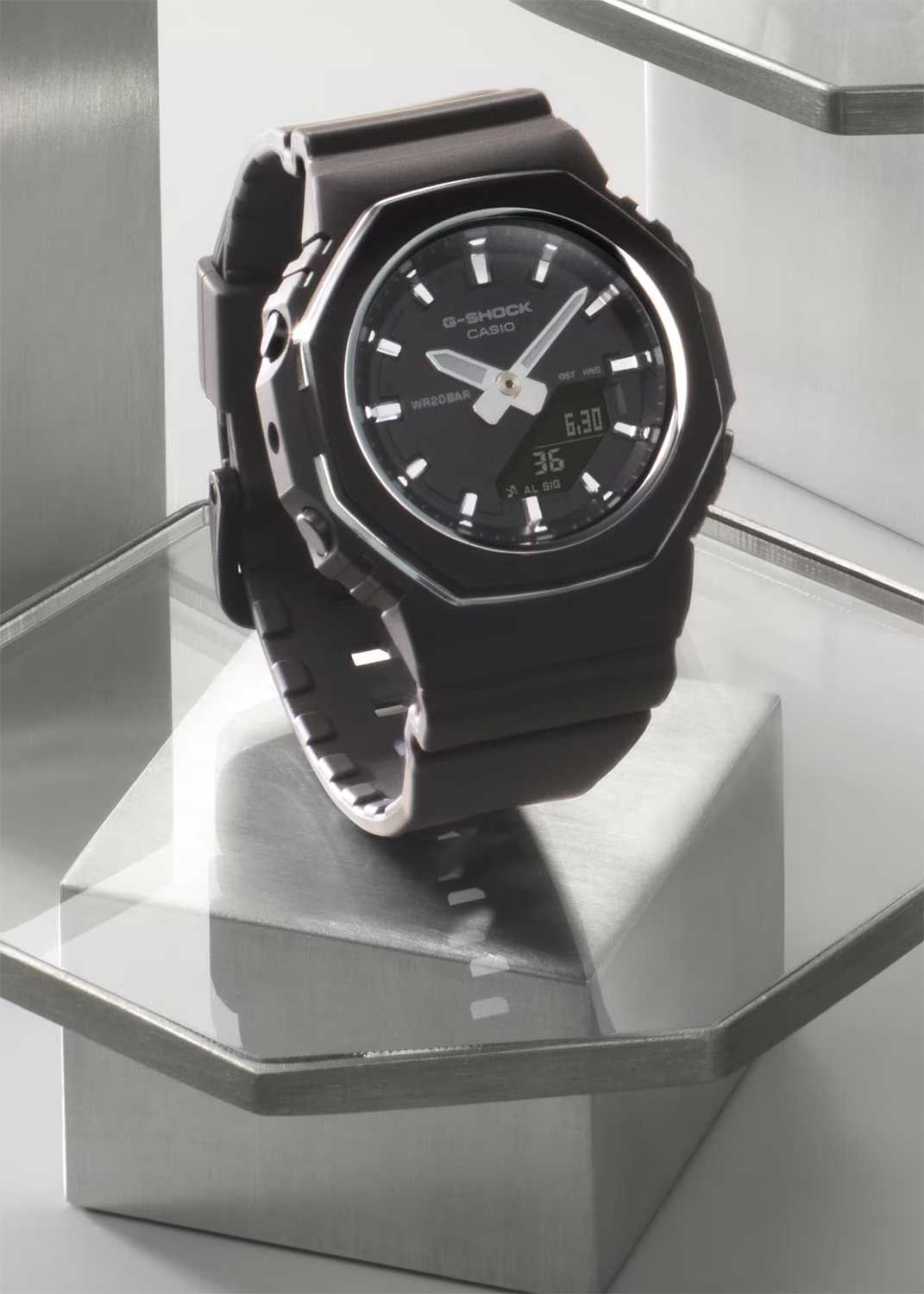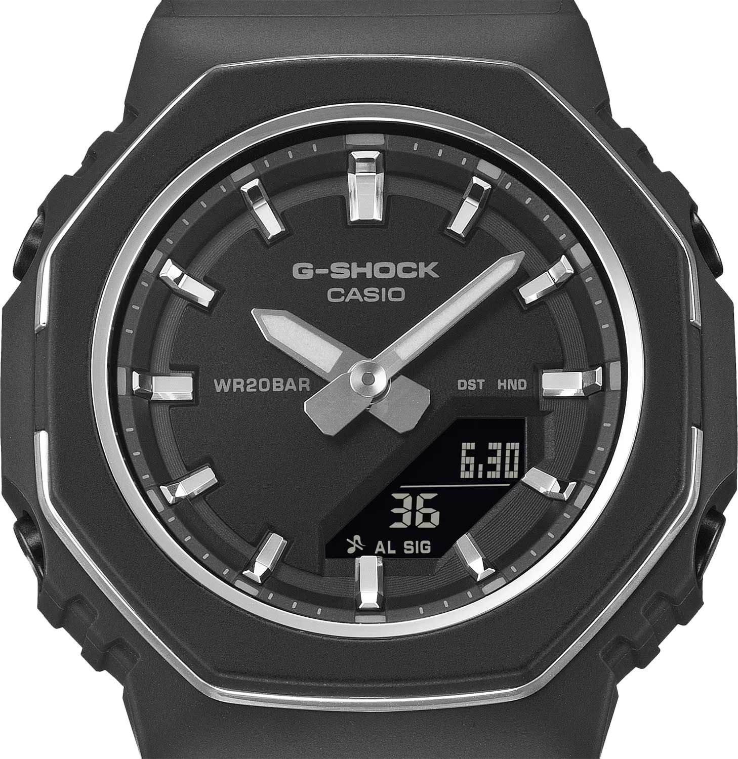 Стильная унисекс модель 2025 года из свежей серии G-SHOCK GMA-P2100 в октагоновом корпусе на полимерном ремешке. Отличается тонким металлическим кольцом, которое отражает свет как от внутреннего, так и от внешнего краев безеля. Модель является уменьшенным вариантом часов из мужской серии джишоков GA-2100, что позволяет ей оптимально выглядеть даже на самых небольших и изящных женских запястьях. Толщина модели всего 11.2 миллиметра, что на момент ее выхода является абсолютным рекордом среди всех джишоков!