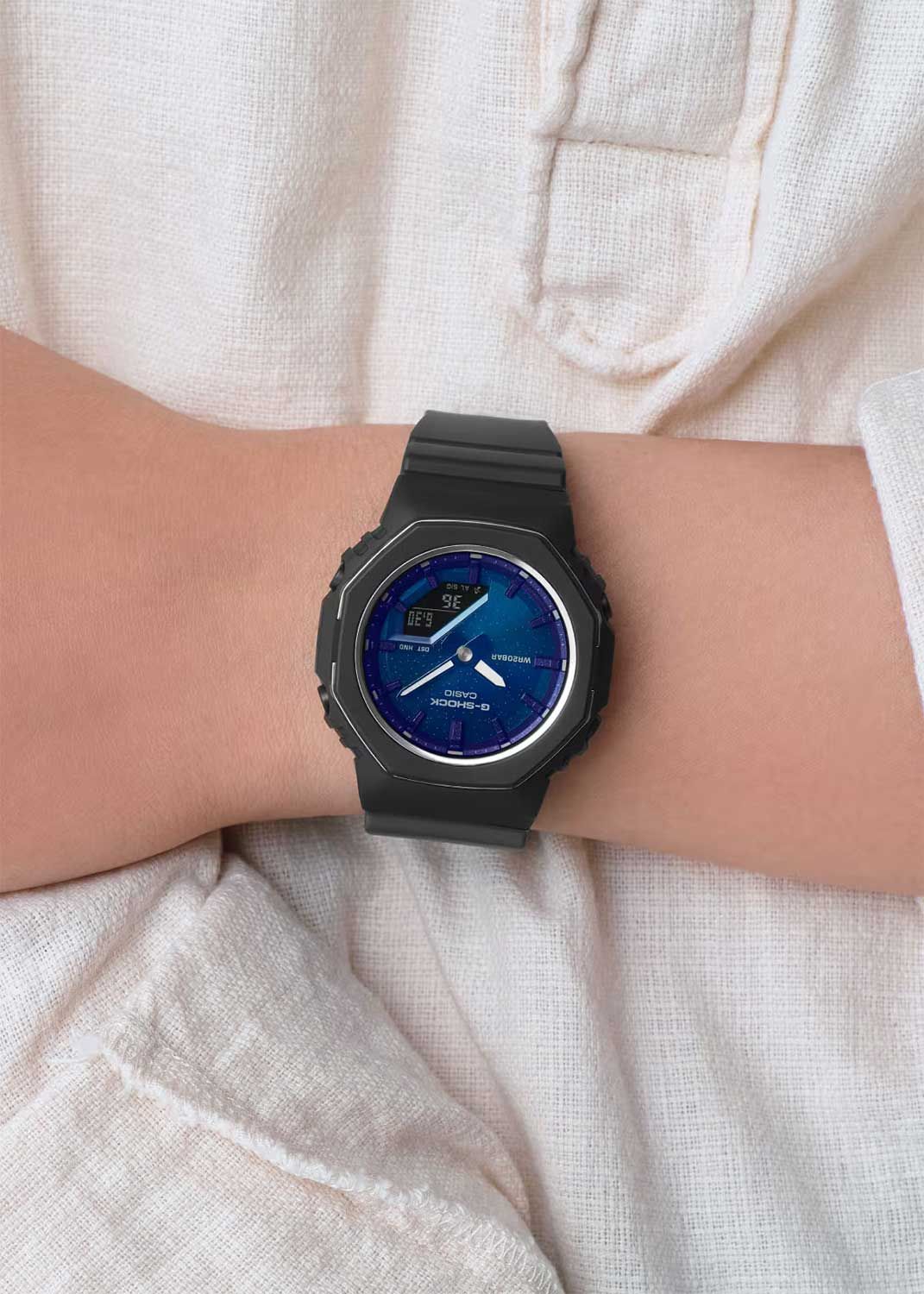 Супер стильная женская модель конца 2025 года из свежей серии G-SHOCK GMA-P2100 в темном матовом октагоновом корпусе на полимерном ремешке с необычным глубоким синим циферблатом с текстурой лазурита. Лазурит — известнейший минерал синего оттенка, имеющий ценные декоративные качества.