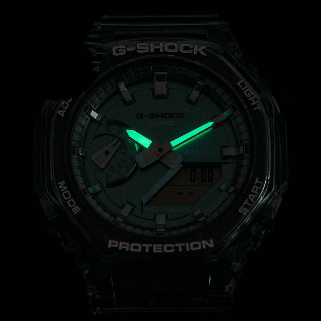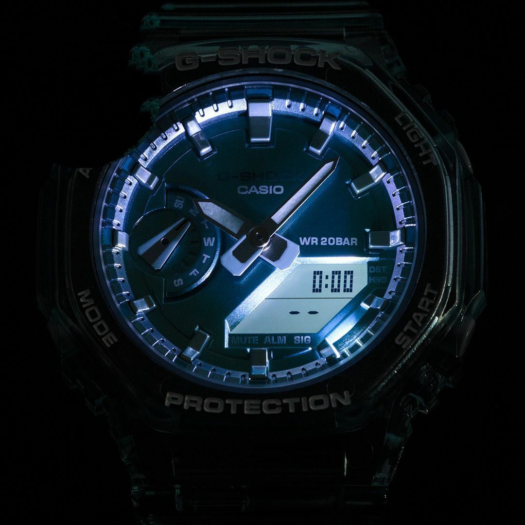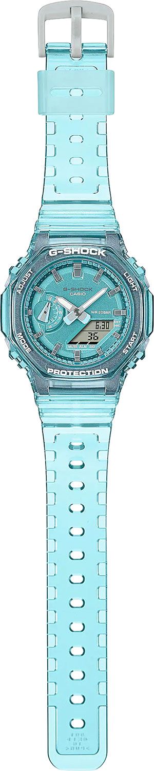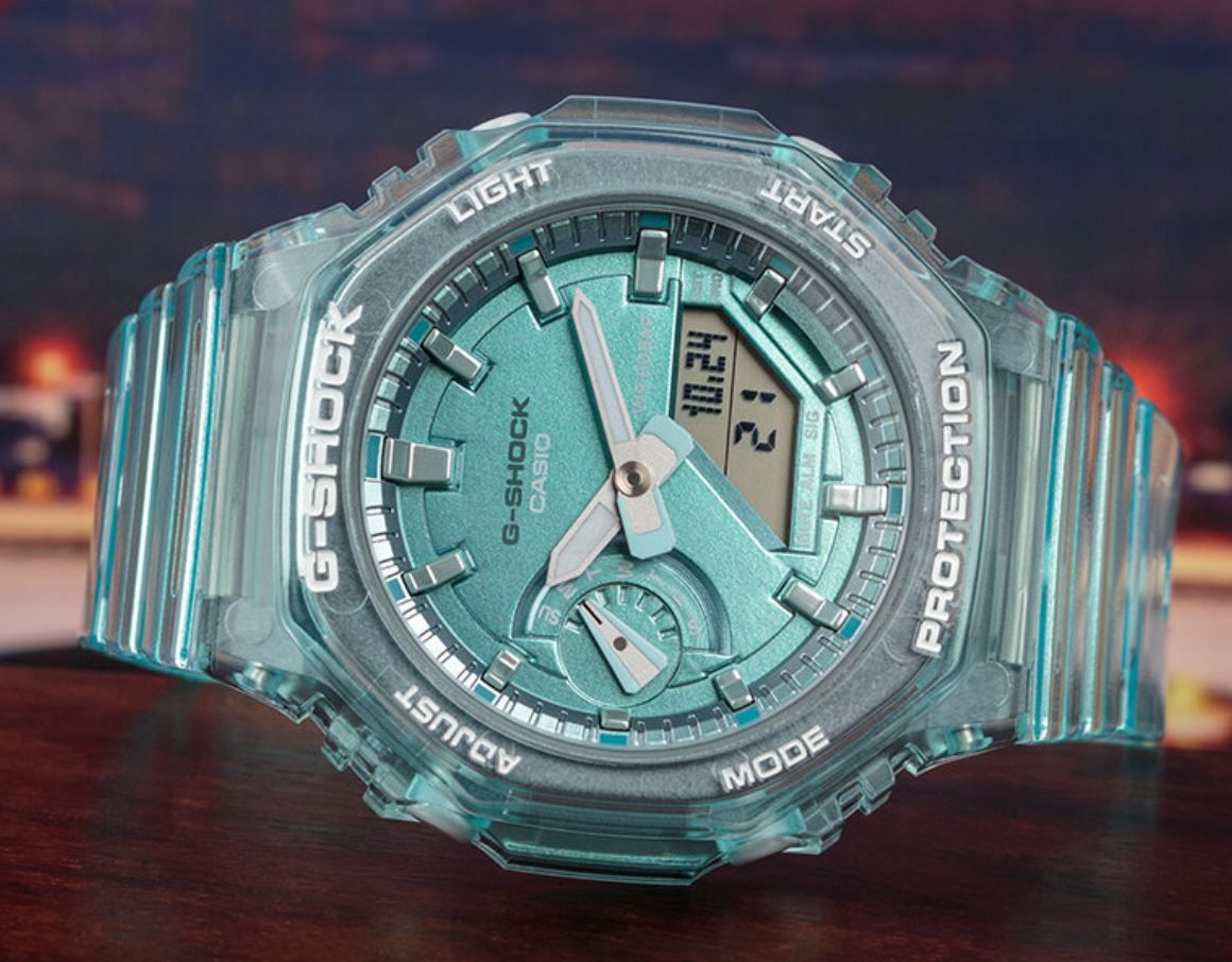 стильная унисекс новинка 2022 года из свежей серии G-SHOCK GMA-S2100 в полупрозрачном бирюзовом корпусе на полимерном ремешке. Модель является уменьшенным вариантом часов из мужской серии джишоков GA-2100, что позволяет ей оптимально выглядеть даже на самых небольших мужских и изящных женских запястьях. Толщина модели всего 11.2 миллиметра, что на момент ее выхода является абсолютным рекордом среди всех джишоков!