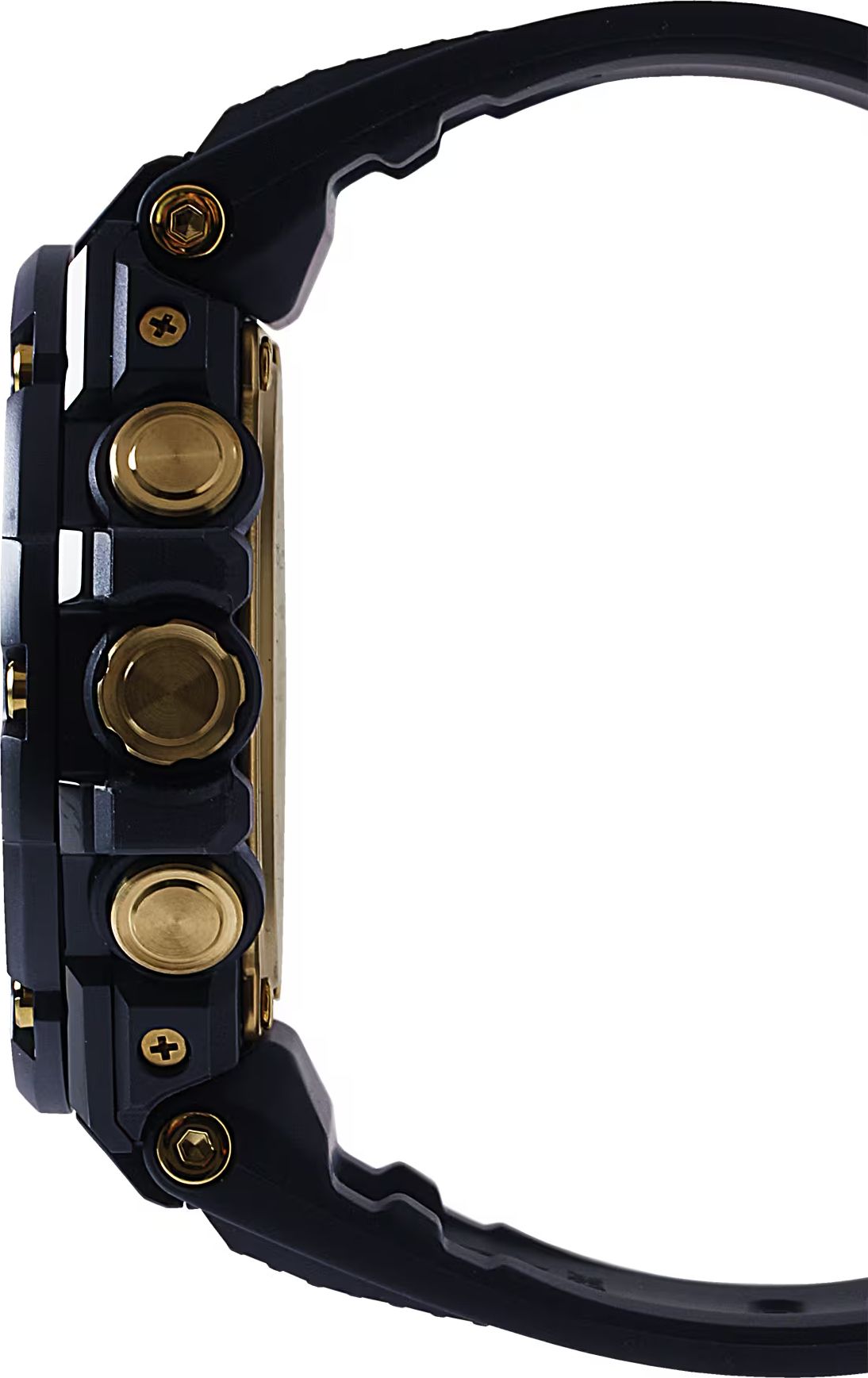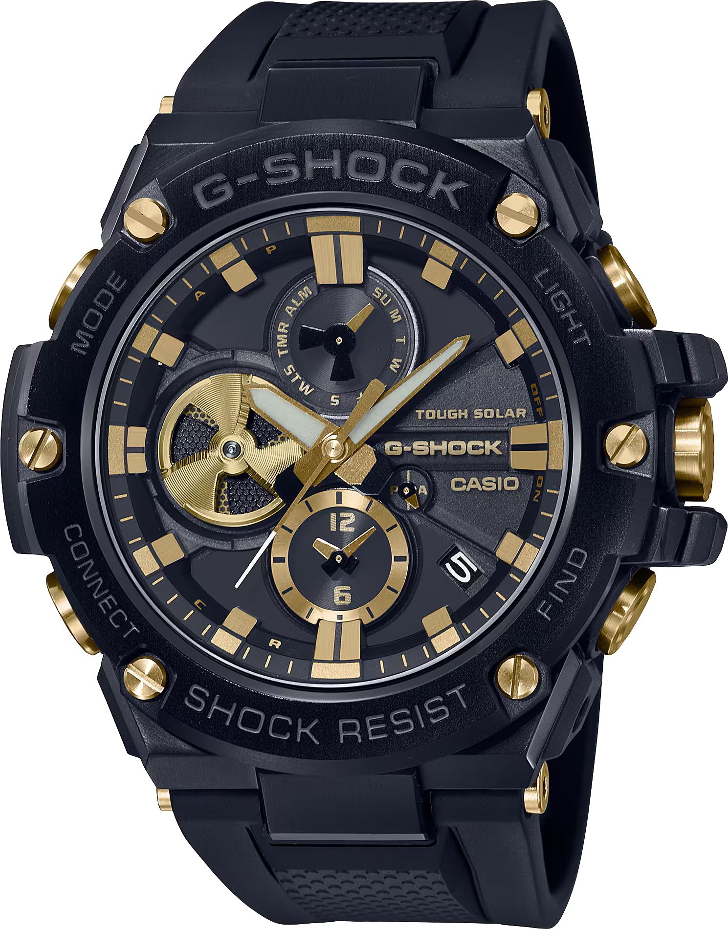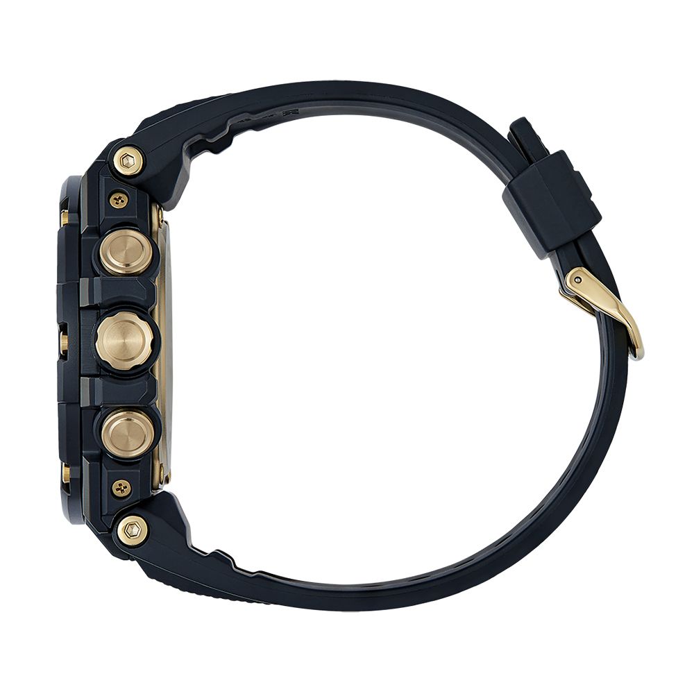 модель GSTB100GC-1A с солнечным питанием и Bluetooth® выполнена в обновленном двухцветном черном исполнении с золотыми акцентами. Часы с премиальными элементами дизайна, такими как устойчивый к царапинам черный IP-покрытие (ионное напыление) безель с золотыми IP-кнопками и застежкой, которые гармонируют с золотыми акцентами на корпусе.