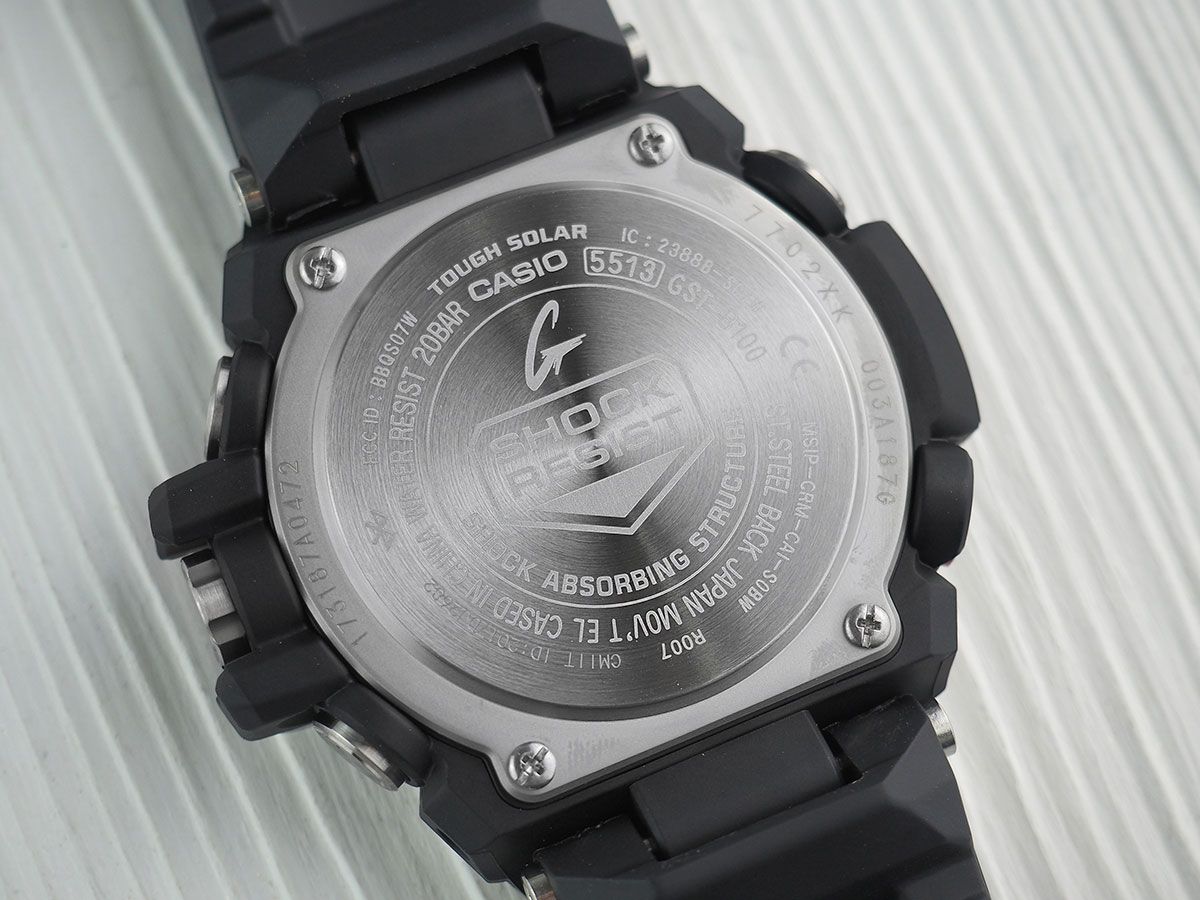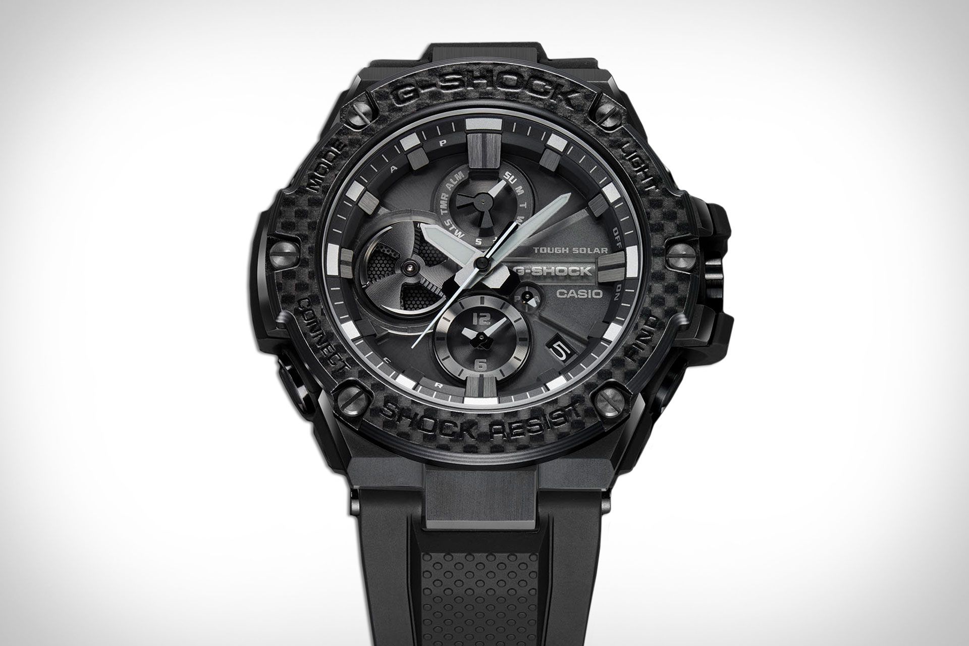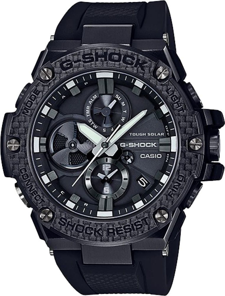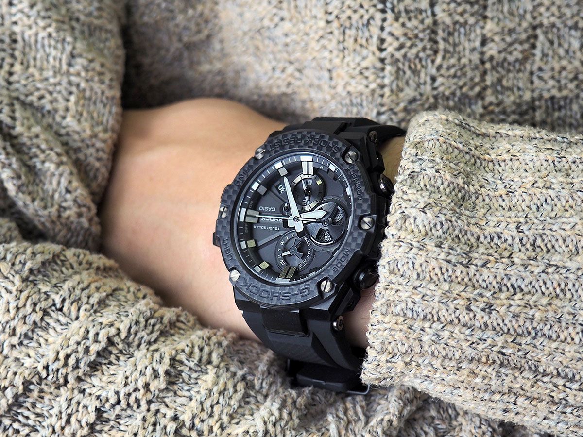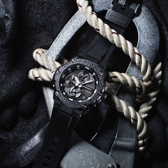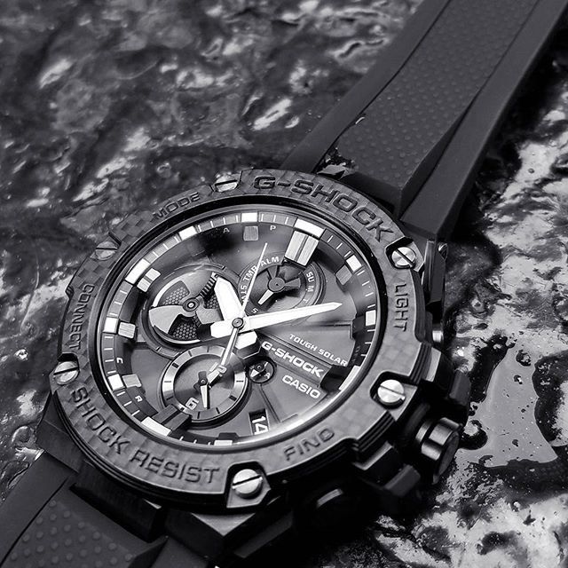 релиз сентября 2017 года из серии G-STEEL. Модель с невероятно прочным и легким карбоновым безелем и сапфировым стеклом! Новый, еще более тонкий корпус из стали и полимера, аналоговый циферблат, появление секундной стрелки и подзаводной головки, — все это визуально выделяет часы GST-B100 от своих собратьев по серии.