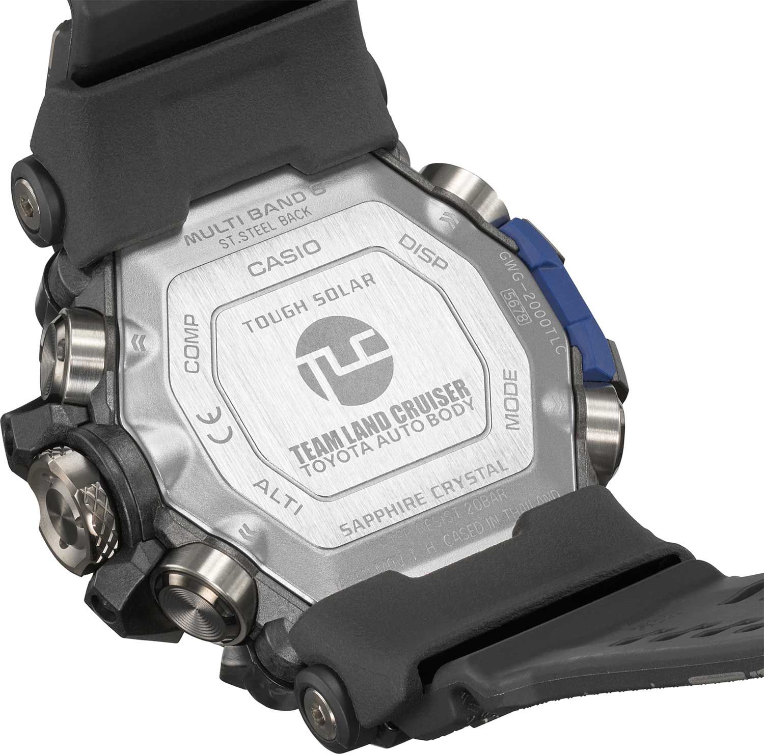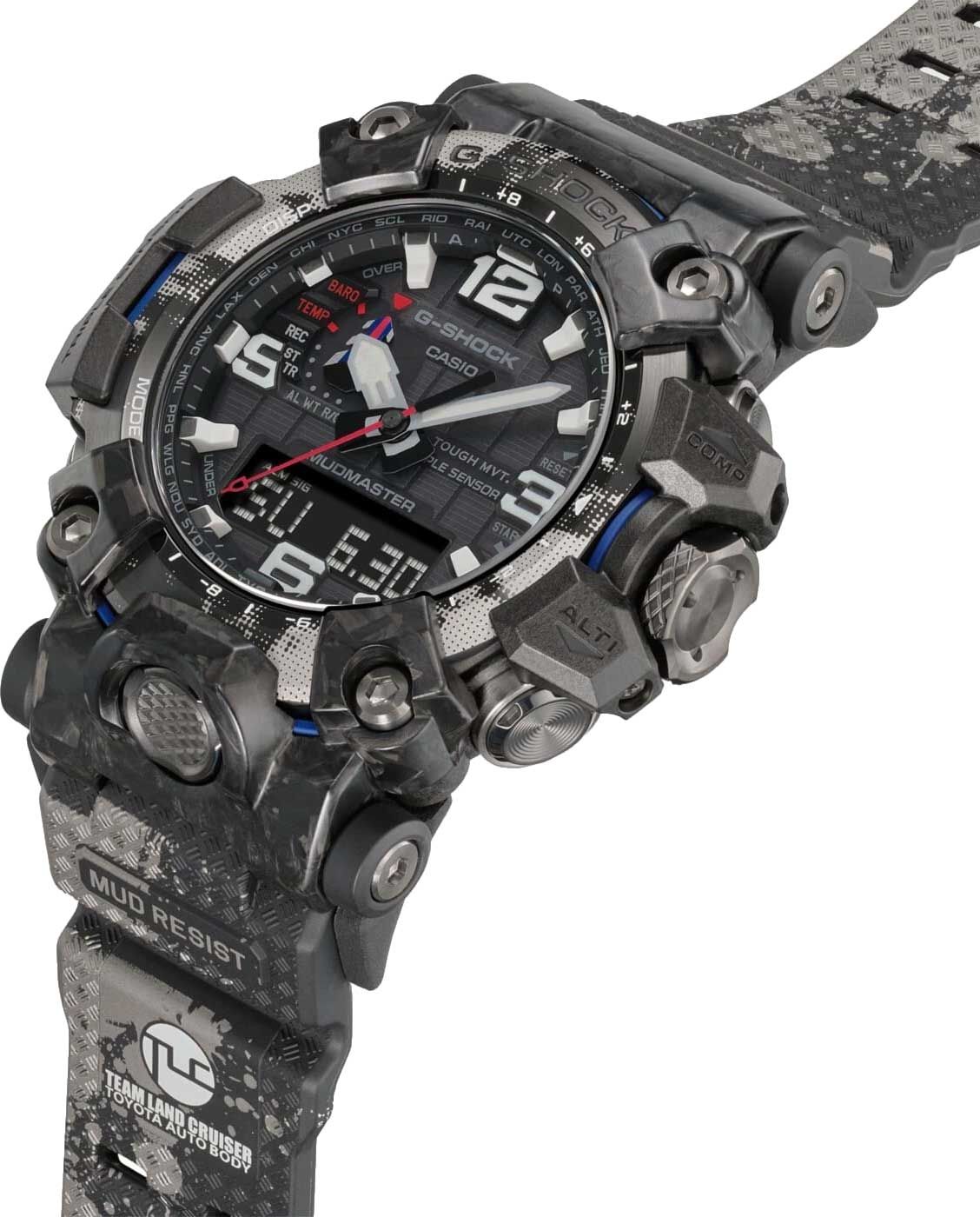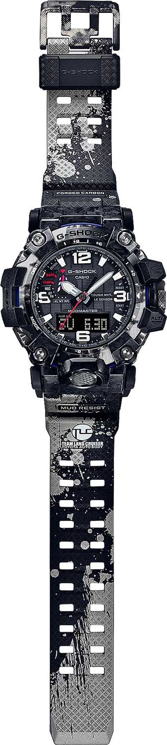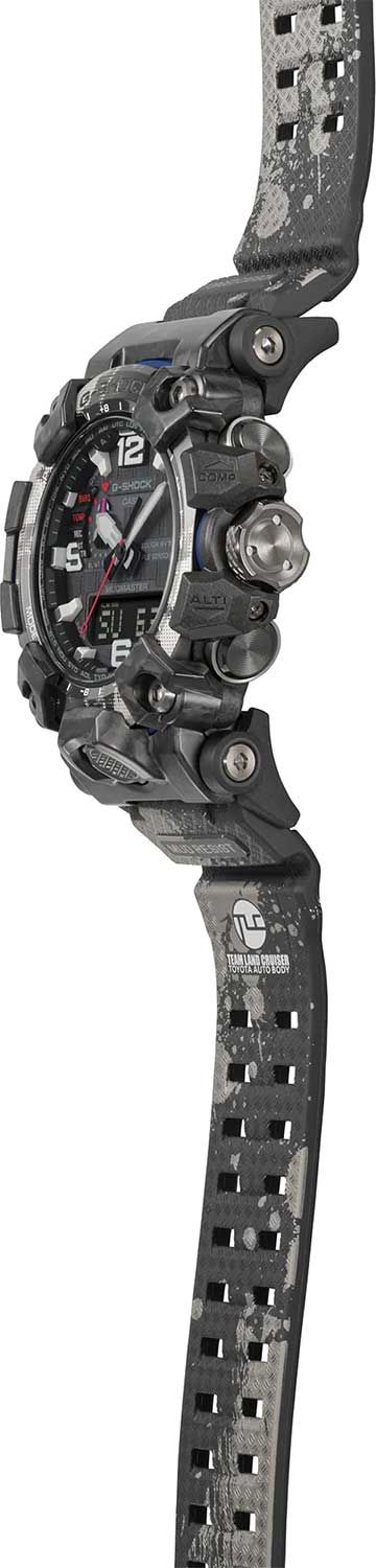 Перед вами коллаборация начала 2022 года бренда G-SHOCK и автомобильной команды Ралли «Дакар» — Team Land Cruiser Toyota Auto Body в виде флагманских сверх-функциональных джишоков из серии MUDMASTER в обновленном корпусе GWG-2000. Часы выделяет агрессивная расцветка, отсылающая нас к цветам японской раллийной команды: черный циферблат и корпус часов дополняют красные и синие детали, а безель и ремешок часов имеют гранжевый черно-белый принт с отсылкой к тяжелейшим природным условиям, сопровождающим ралли «Дакар», которые проявляются в постоянной борьбе с пылью, песком и грязью.