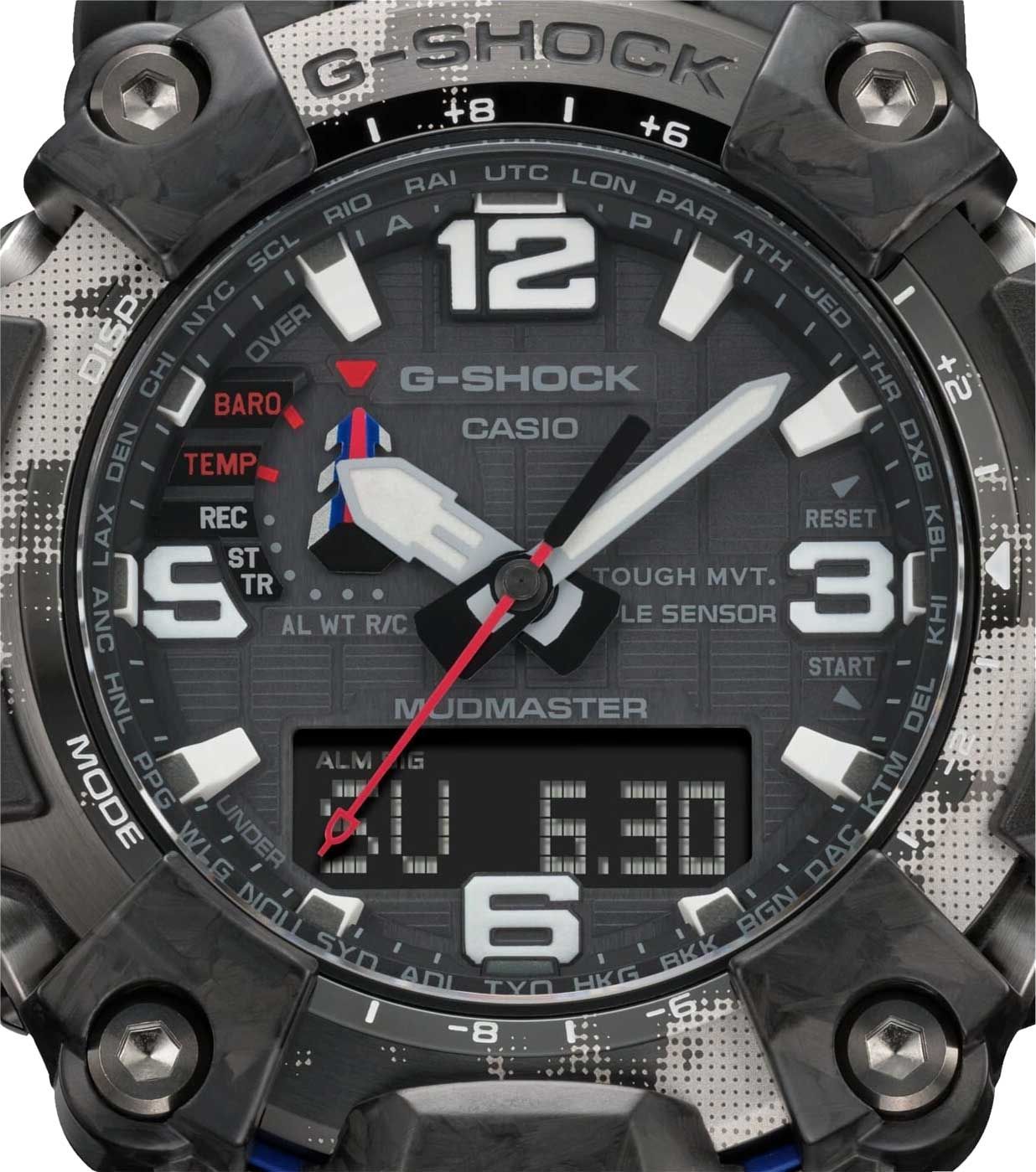 Напомним, что благодаря технологиям абсолютной пыле- и грязеустройчивости, а также защите от самых мощных вибраций, модели серии MUDMASTER можно эффективно использовать в самых агрессивных условиях. Интересно, что получаемая при производстве часов карбоновая текстура корпуса является уникальной для каждой модели и вы не встретите две одинаковых модели с одинаковой текстурой.