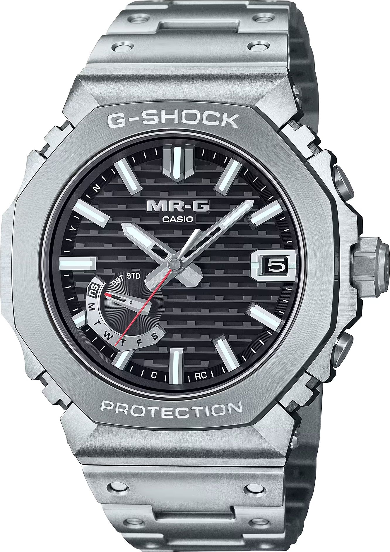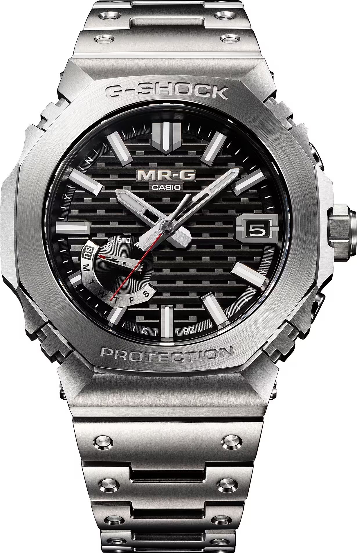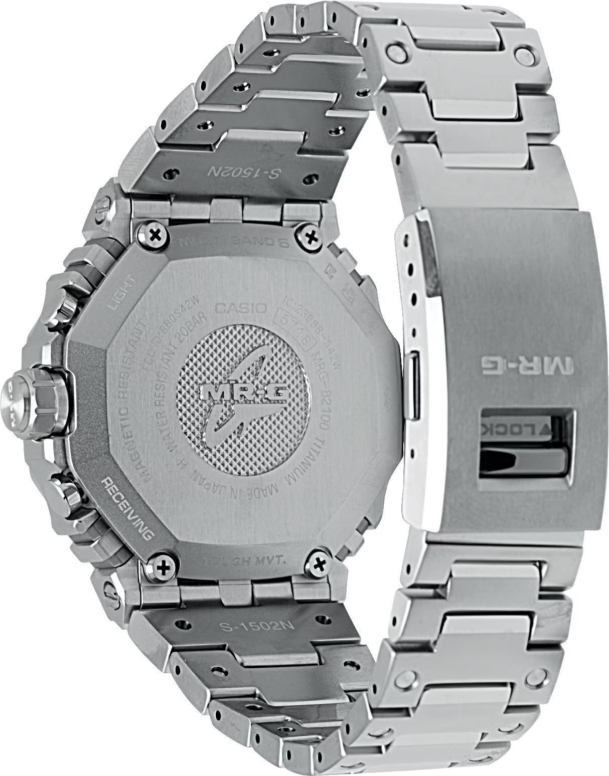 Модель 2024 MRG-B2100, созданная в области мастерства работы с металлом, корпус и безель изготовленны из сверхтвердого титанового сплава Ti64. Верхняя часть безеля изготовлена из COBARION, сплава, который в четыре раза тверже чистого титана и имеет блеск, сравнимый с платиной. Браслет изготовлен из другого специального титанового сплава, DAT55G, который чрезвычайно тверд и легко поддается обработке.