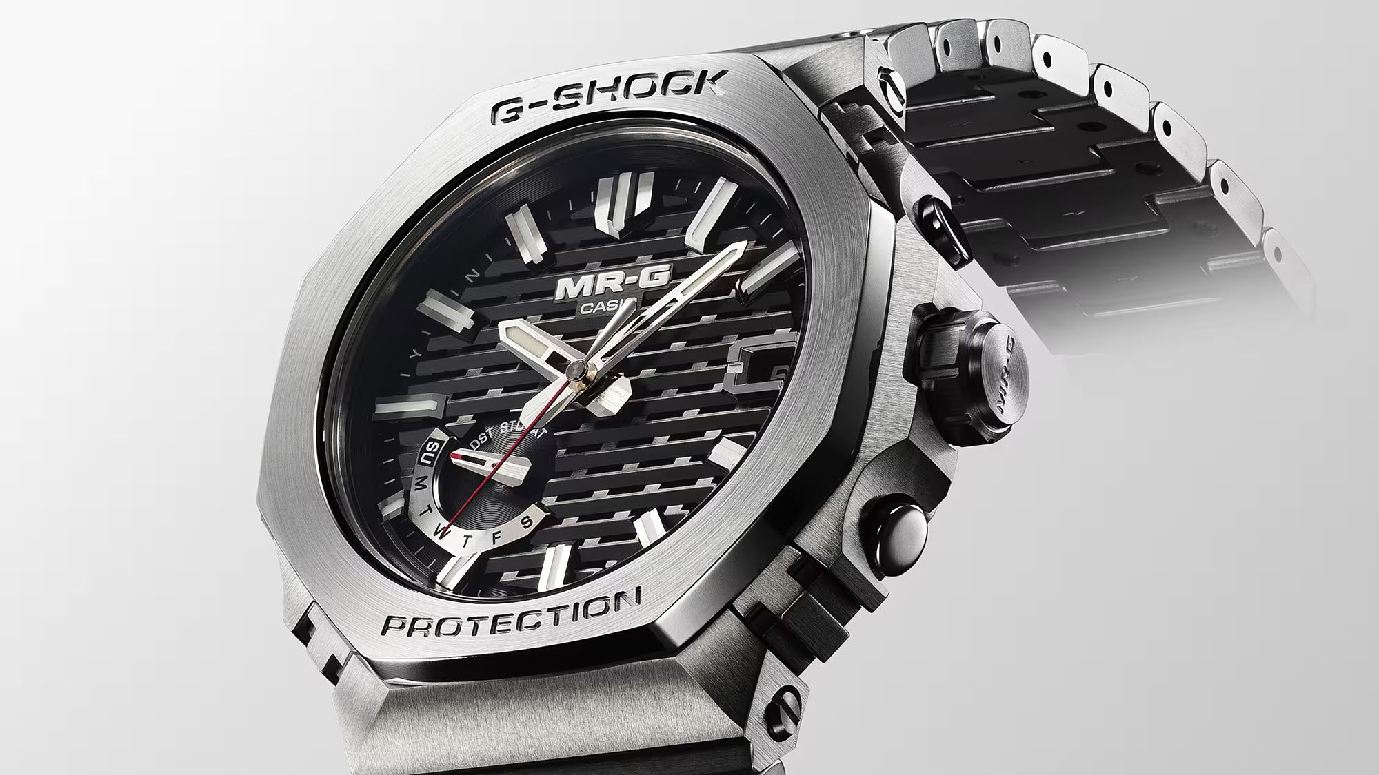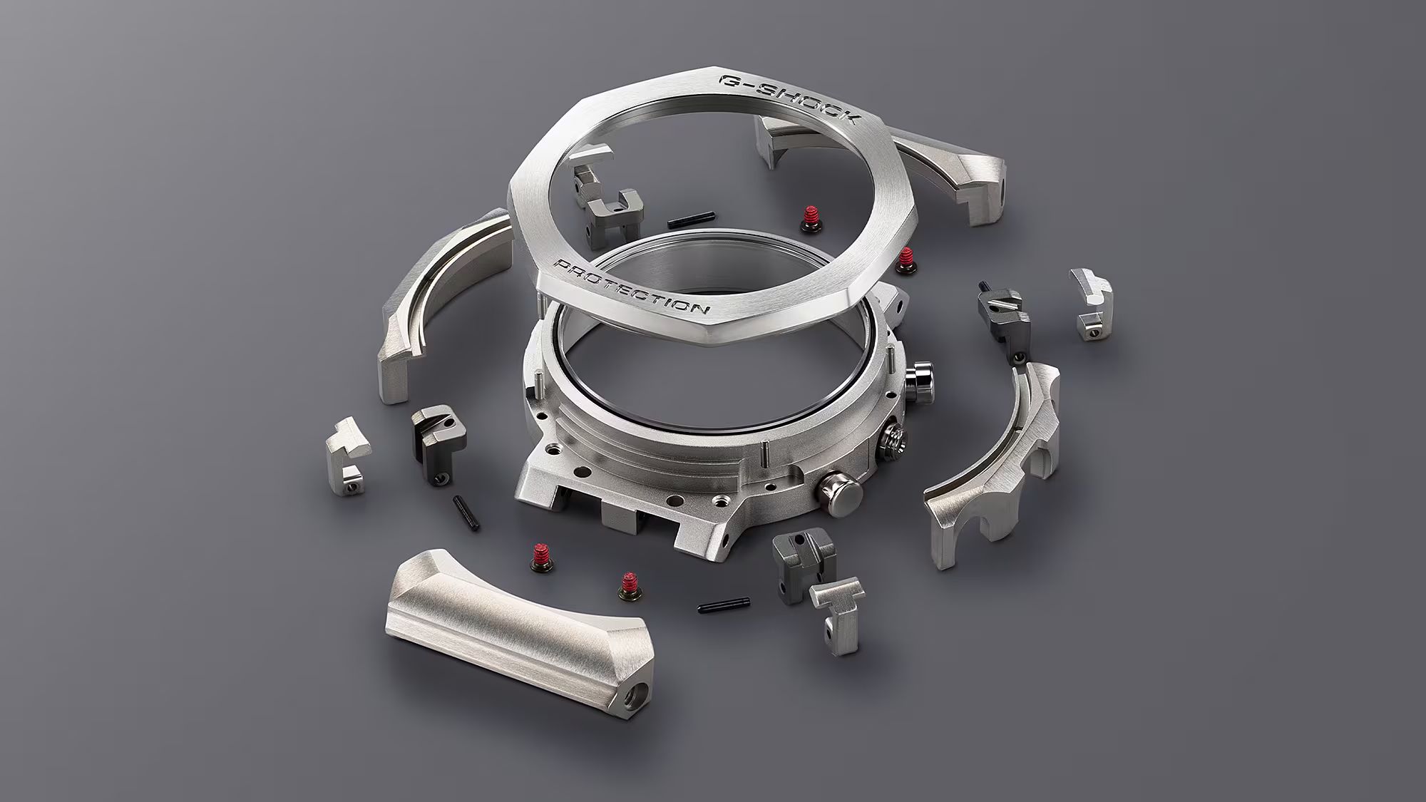Один только безель состоит из 27 различных компонентов, каждый из которых индивидуально отполирован для создания потрясающей детализированной текстуры. Современная многофункциональная структура Multi-Guard включает в себя буферы между частями многокомпонентного безеля и корпуса, обеспечивающие превосходную амортизацию безеля, и защищает специальный модуль MR-G с помощью позолоченной фиксирующей пластины.