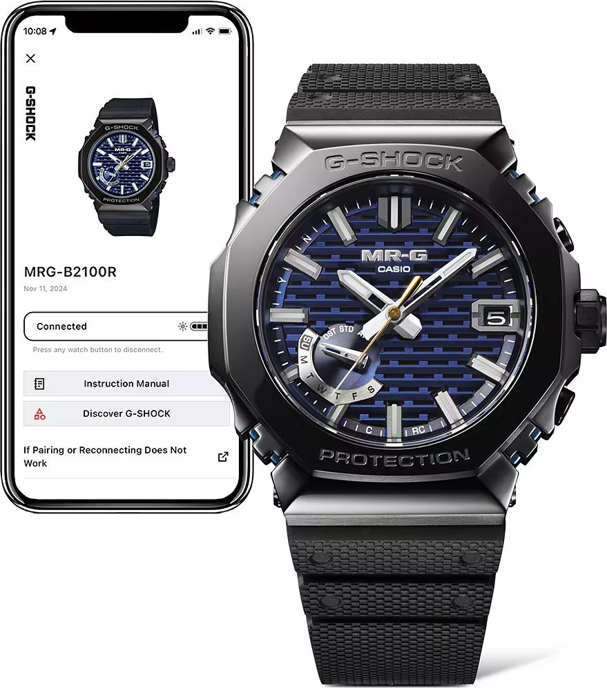 В остальном — без изменений. Как и ранее выпущенные G-SHOCK MRG-B2100B-1A, новинка заключена в корпус из сверхтвердого титанового сплава Ti64 (при этом верхняя часть безеля, состоящего из 27 различных компонентов, выполнена из сплава COBARION, блеск которого сравнивают с платиной), а также дополнена ремешком из фторкаучука с титановой застежкой.
