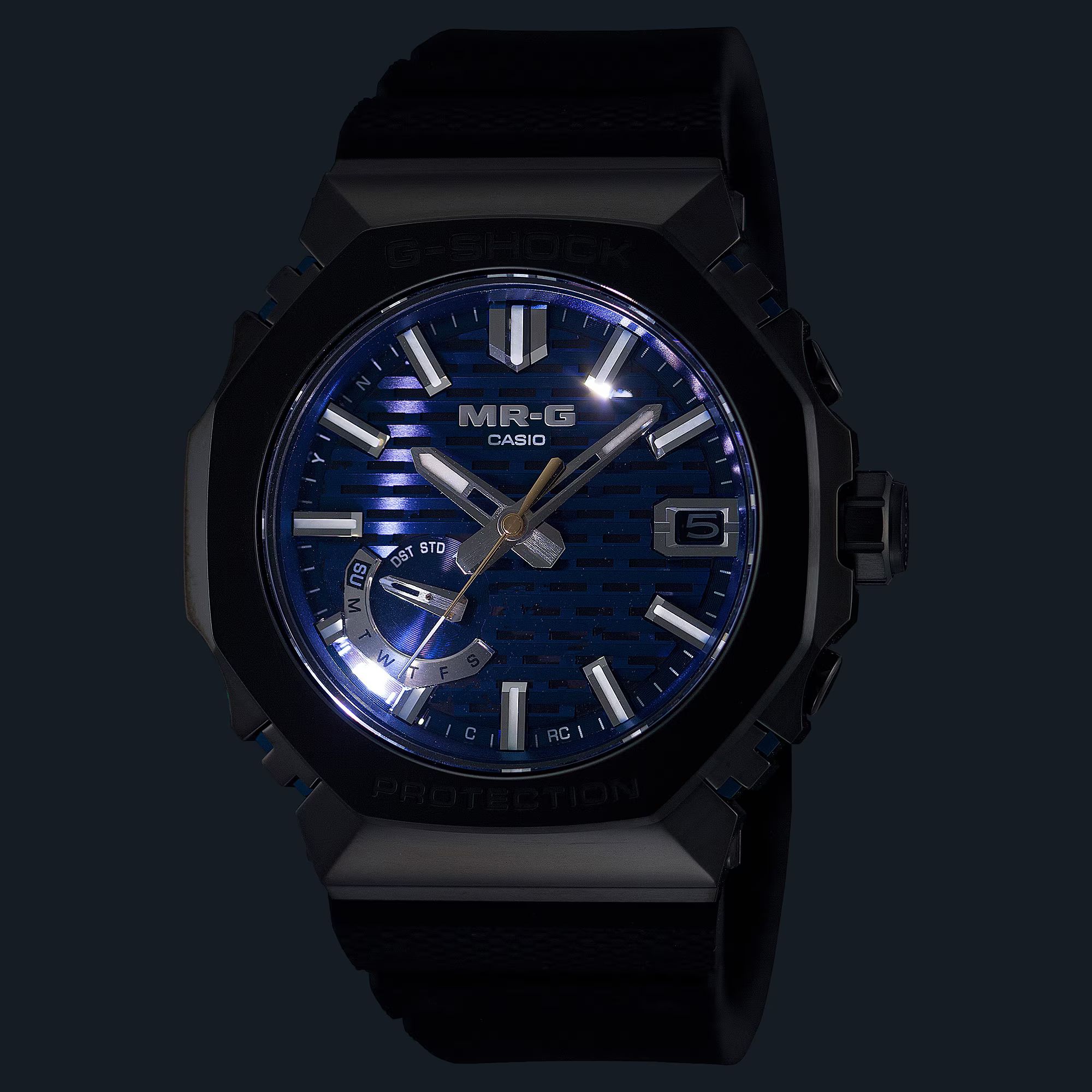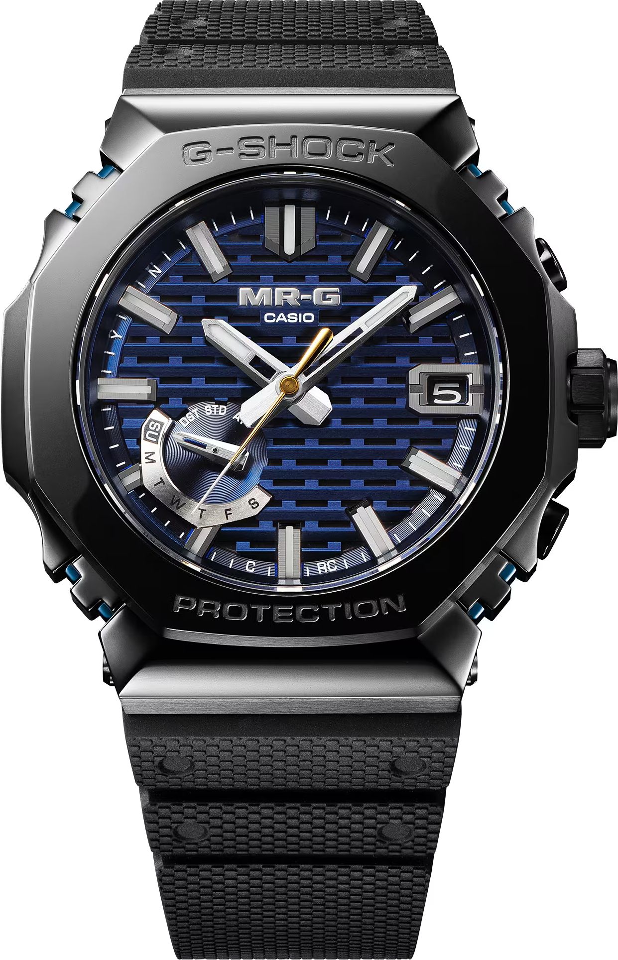 Премиальная новинка G-SHOCK MRG-B2100R-2A отдает дань уважения традиционной японской живописи тушью и искусству каллиграфии, на что указывает выразительное оформление в оттенке синих чернил Ао-дзуми. Богатейшее культурное наследие нашло свое отражение и в циферблате модели, состоящем из большого количества мелких деталей.