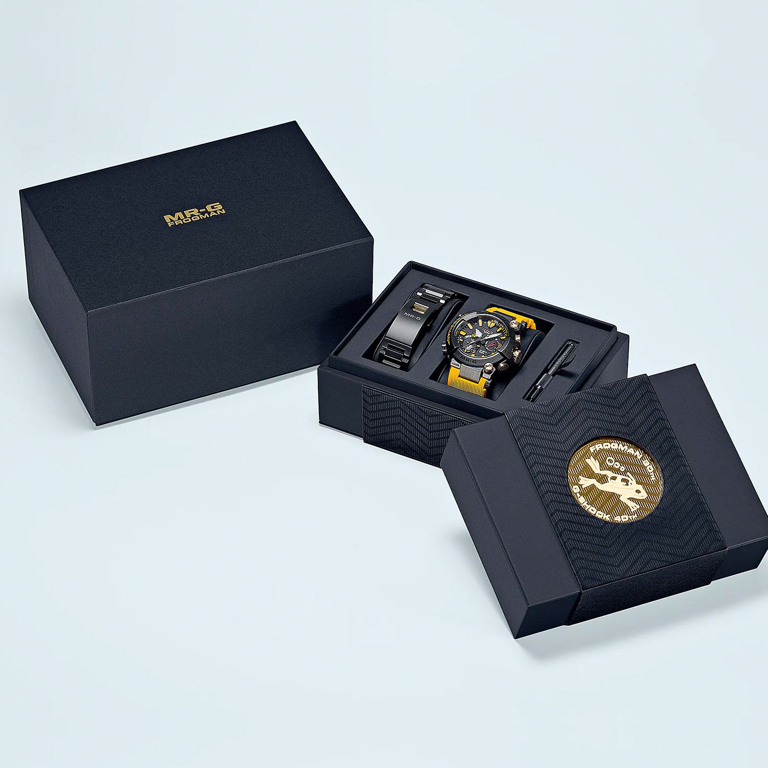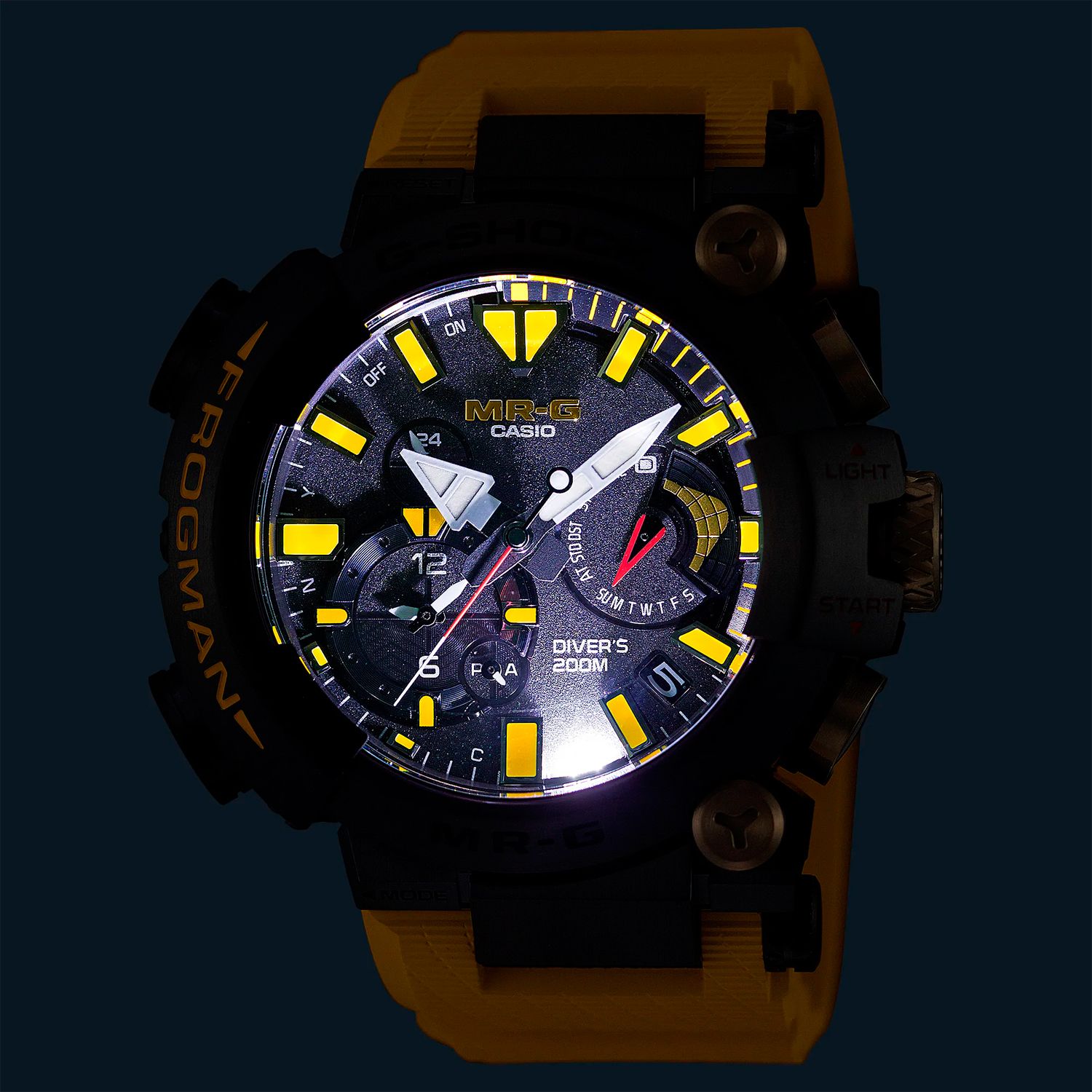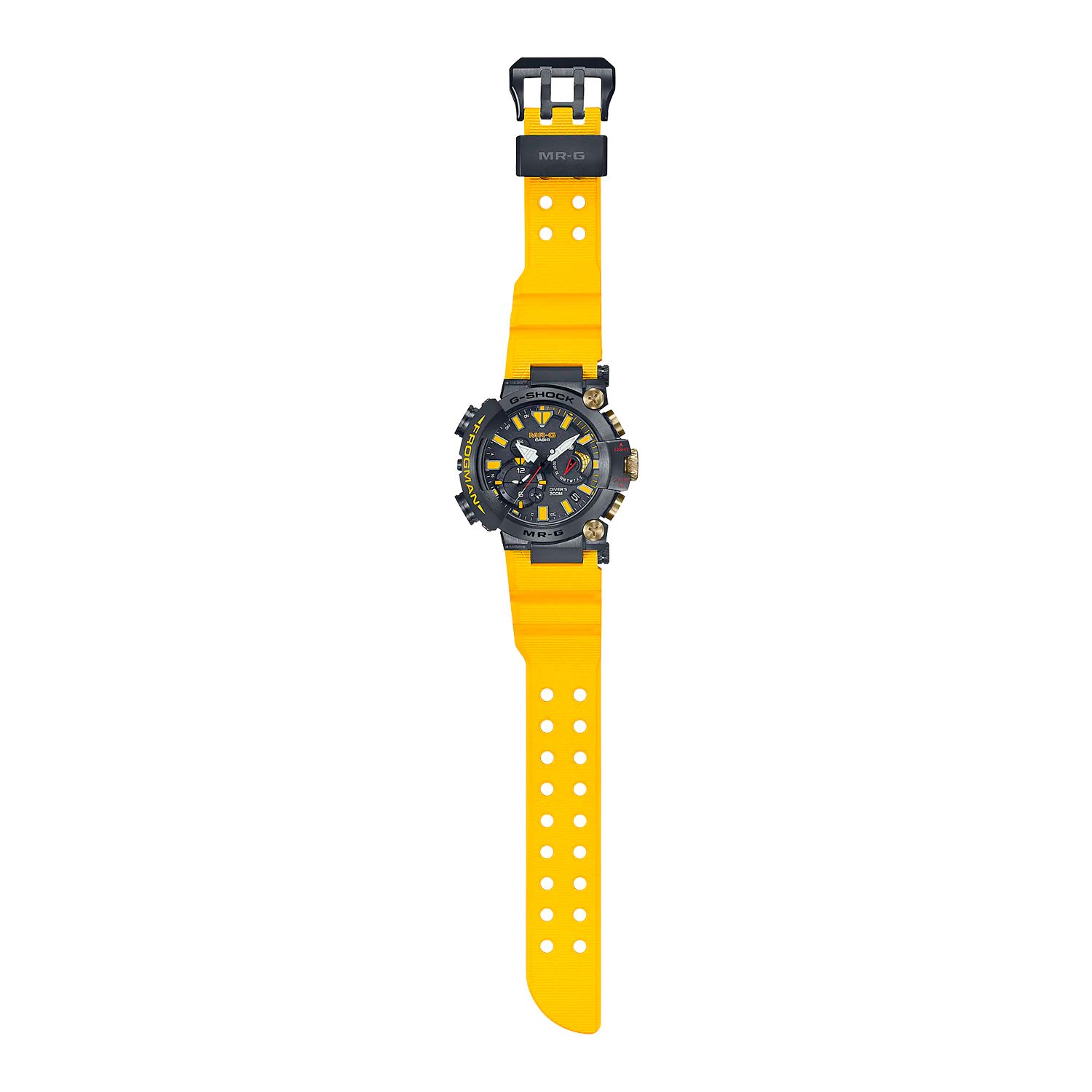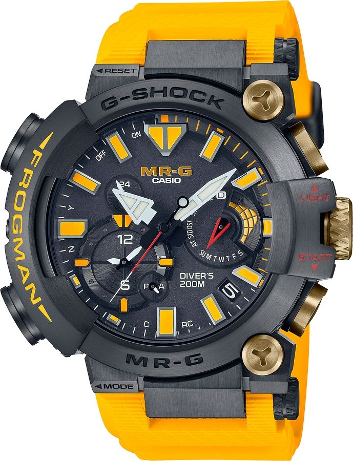 G-SHOCK продолжают празднование 30-летия культовых дайверских FROGMAN выпуском лимитированных MRG-BF1000E-1A9 с желтым ремешком (всего будет выпущено 700 экземпляров). Яркое цветовое оформление новинки отдает дань уважения первым FROGMAN (DW-6300-1A) с желтыми надписями на корпусе. Его дополняют акцентные вкрапления золота (ионное покрытие) на заводной головке, кнопках и винтах, а также золотистое напыление с гравировкой (изображение культовой лягушки) на задней крышке из сапфирового стекла.