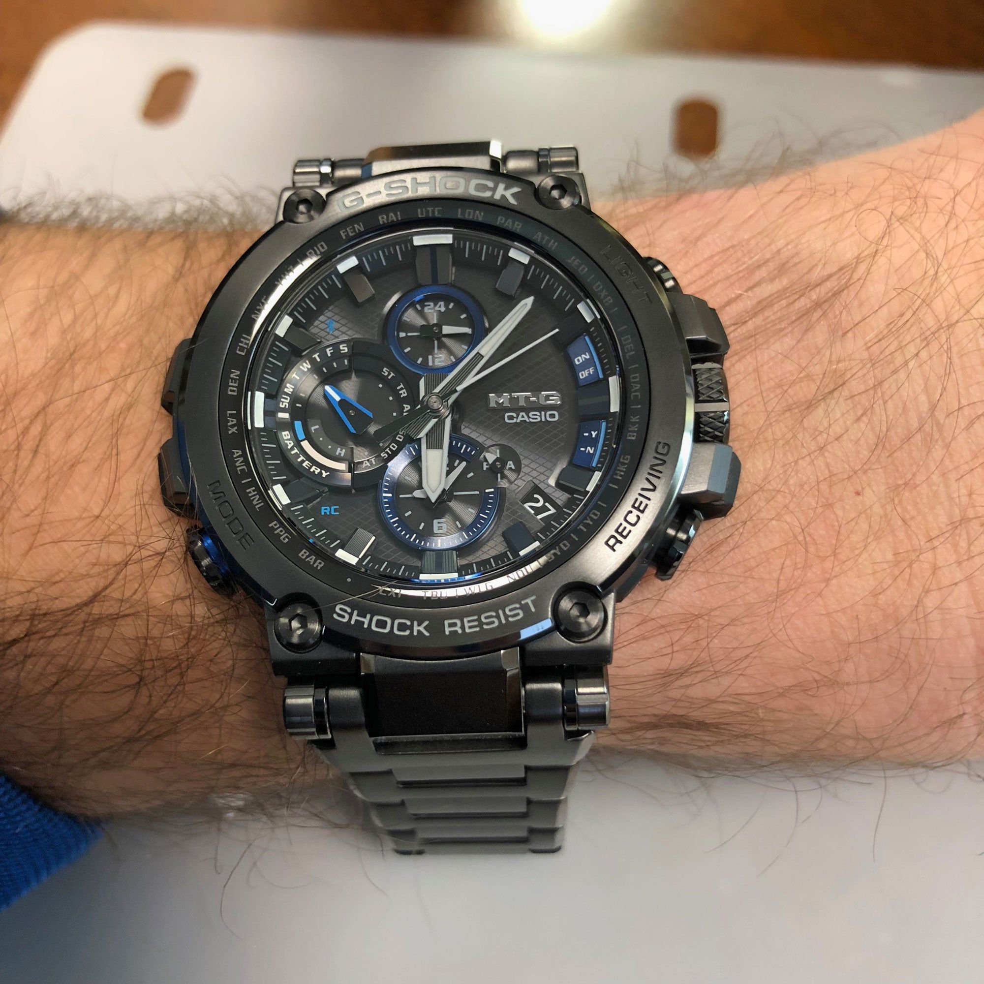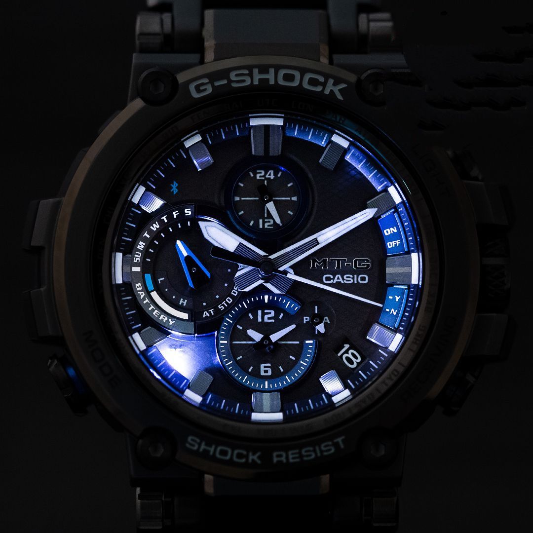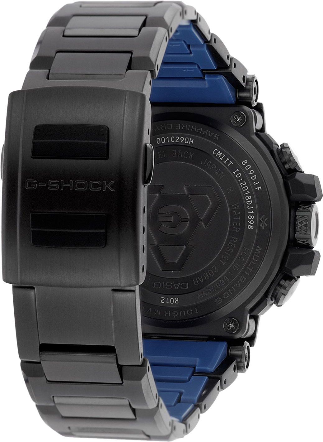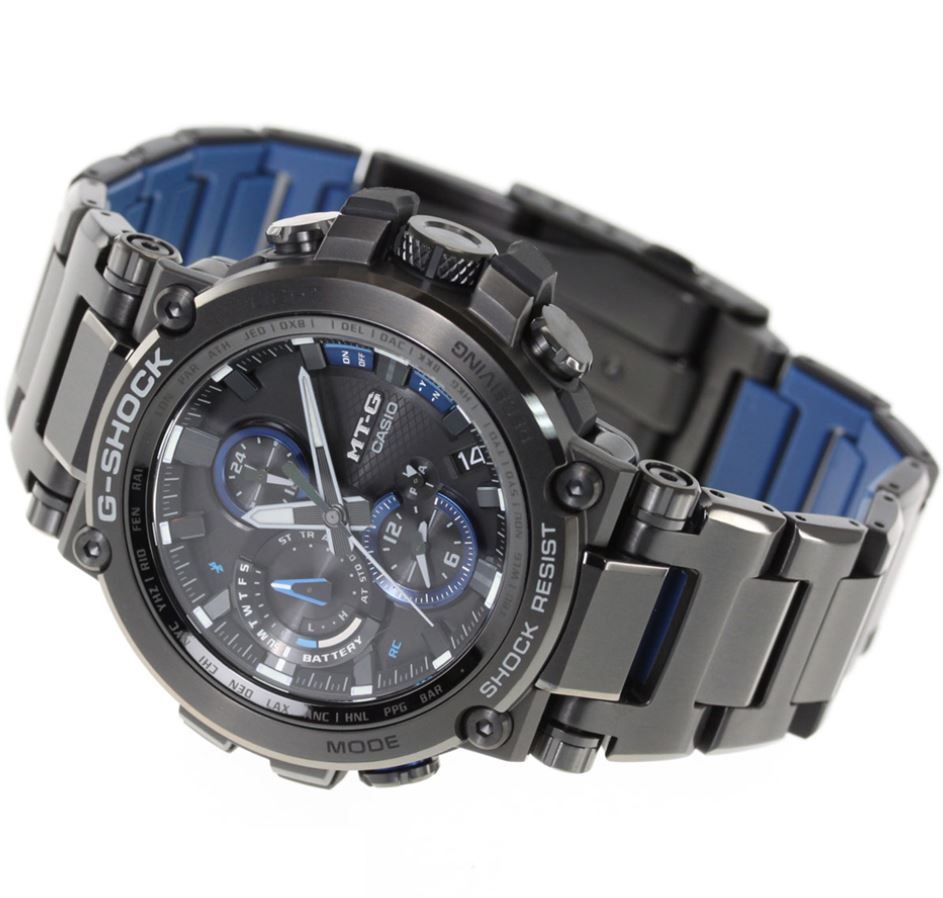 Большой релиз Базеля 2018 года от Casio в черной стали с синими деталями циферблата — новое поколение премиальной стальной серии G-Shock MTG. Модель обладает новым супер-стильным дизайном, переосмысленной структурой корпуса, из-за чего получилось сделать его более компактным и тонким, нежели предыдущие модели MTG. Полимерная часть корпуса теперь дополнительно усилена карбоновыми волокнами. Внутренняя часть стального браслета имеет отделку из синего полимера, что добавляет более комфортное ощущение часов на руке.